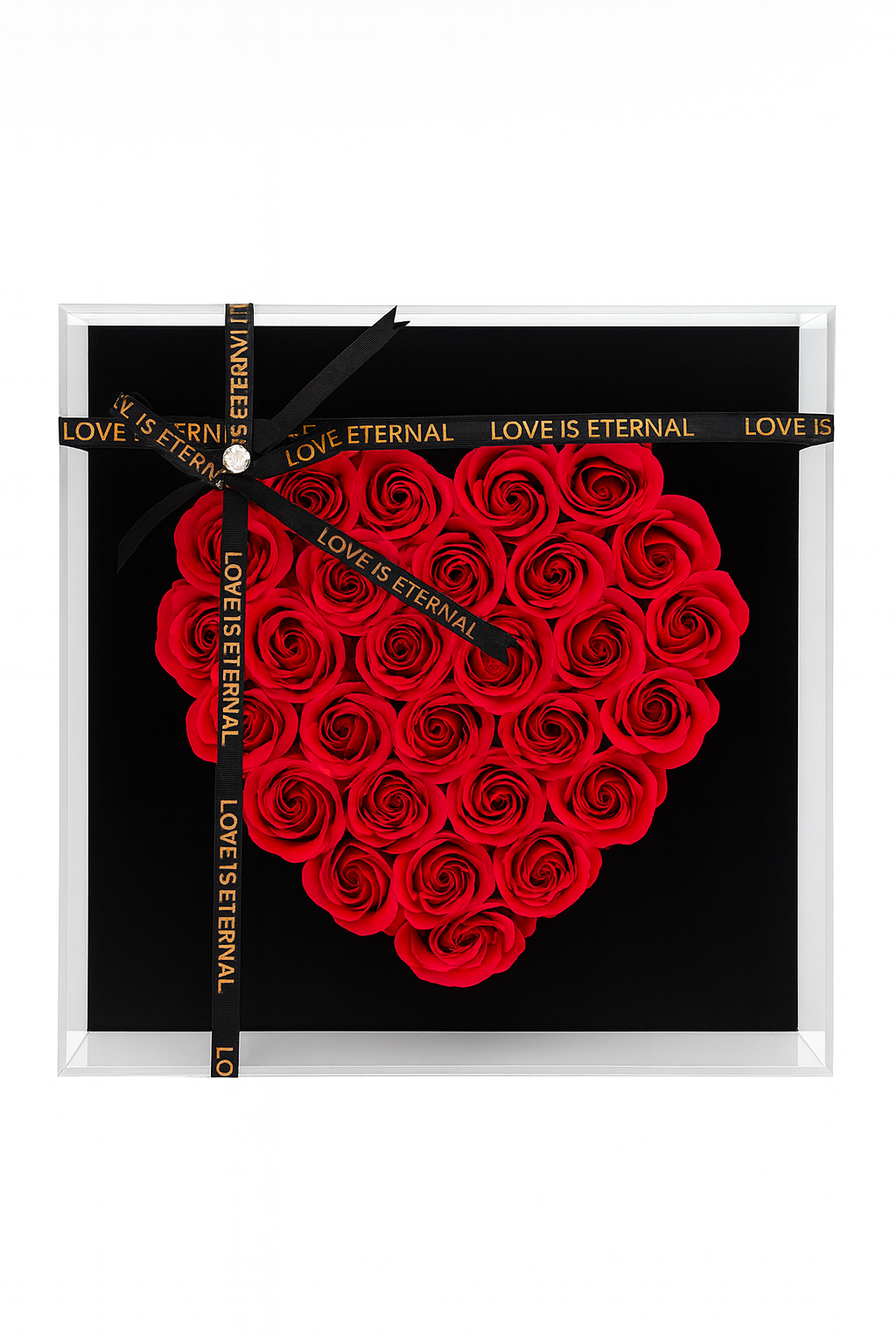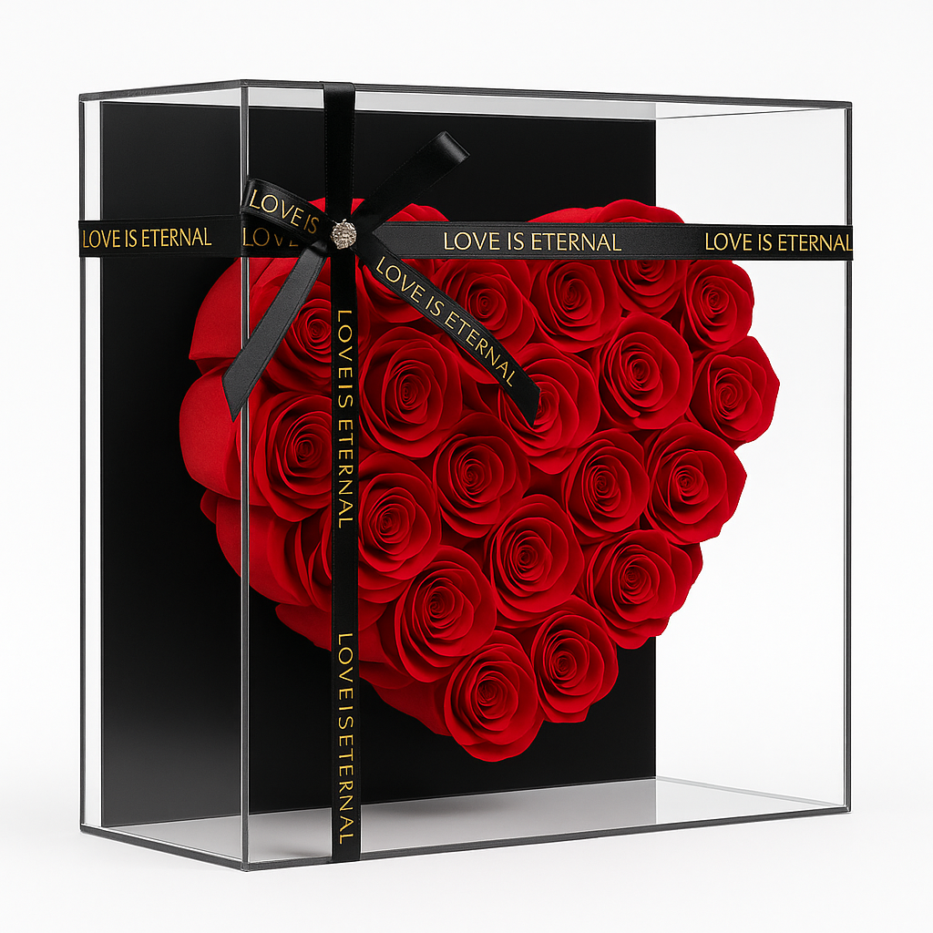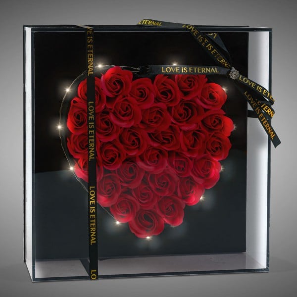 Cutia premium, cu fereastra transparenta si banda decorativa “Love is Eternal”, este special conceputa pentru a face cadoul spectaculos din prima clipa. Luminitele LED creeaza un efect romantic si modern, subliniind conturul inimii si intensitatea rosului.