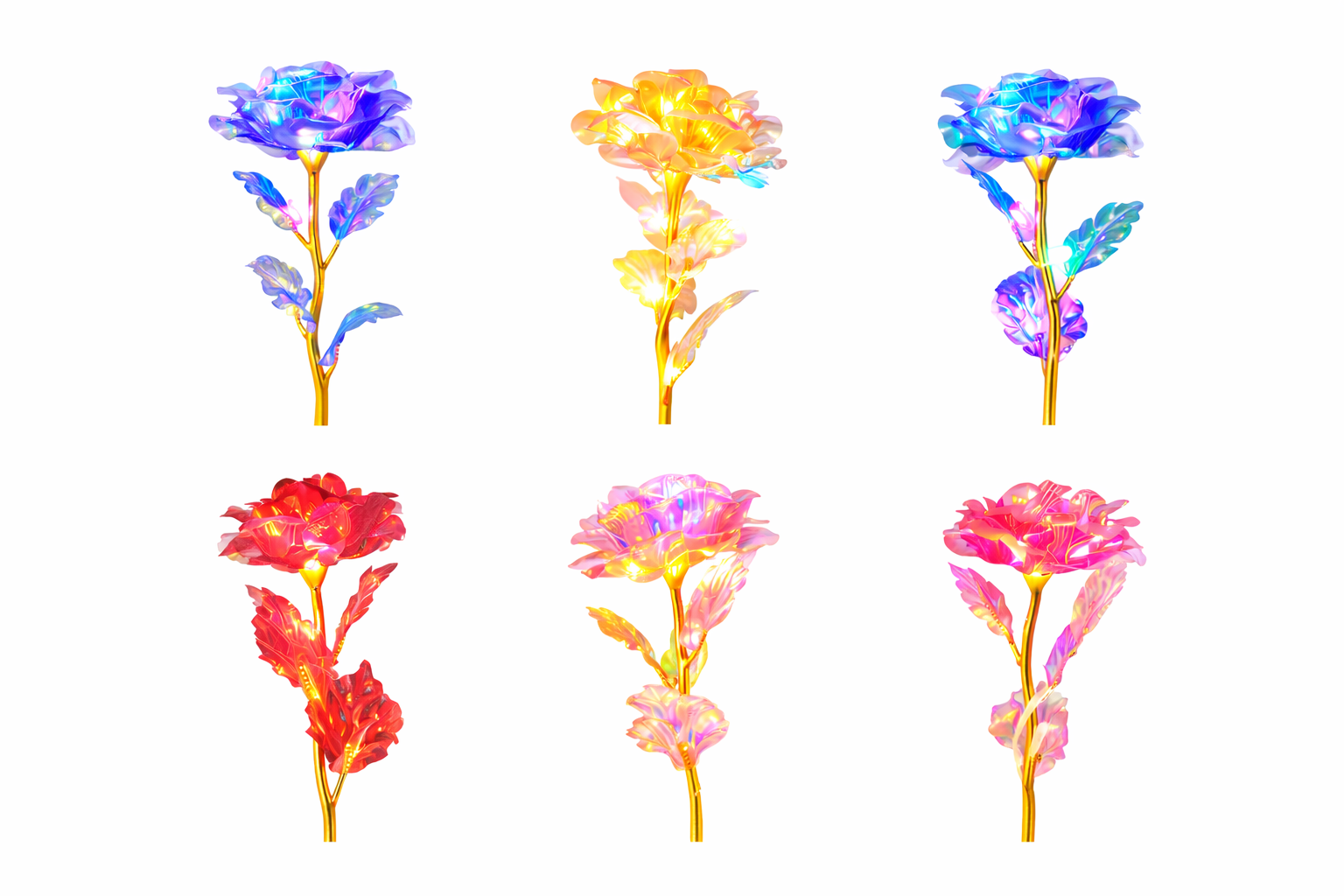 Florile sunt prevazute cu instalatie LED discreta, alimentata cu baterii, oferind un efect vizual deosebit, potrivit pentru cadouri simbolice, Valentine’s Day, aniversari sau decorarea vitrinelor comerciale. Ambalajul transparent tip cadou permite oferirea produsului fara impachetare suplimentara.