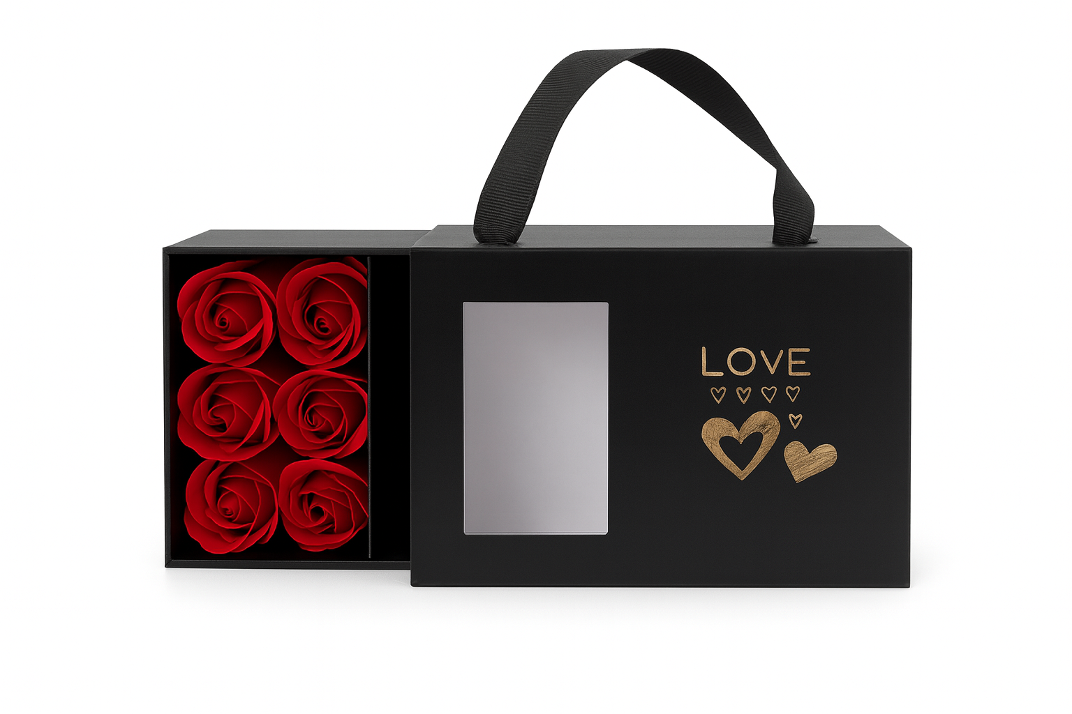 Interiorul este compartimentat, oferind un spatiu dedicat celor 6 trandafiri de sapun si un compartiment liber, ideal pentru a adauga un mic obiect suplimentar, precum bijuterii, bani, dulciuri sau un mesaj personalizat.