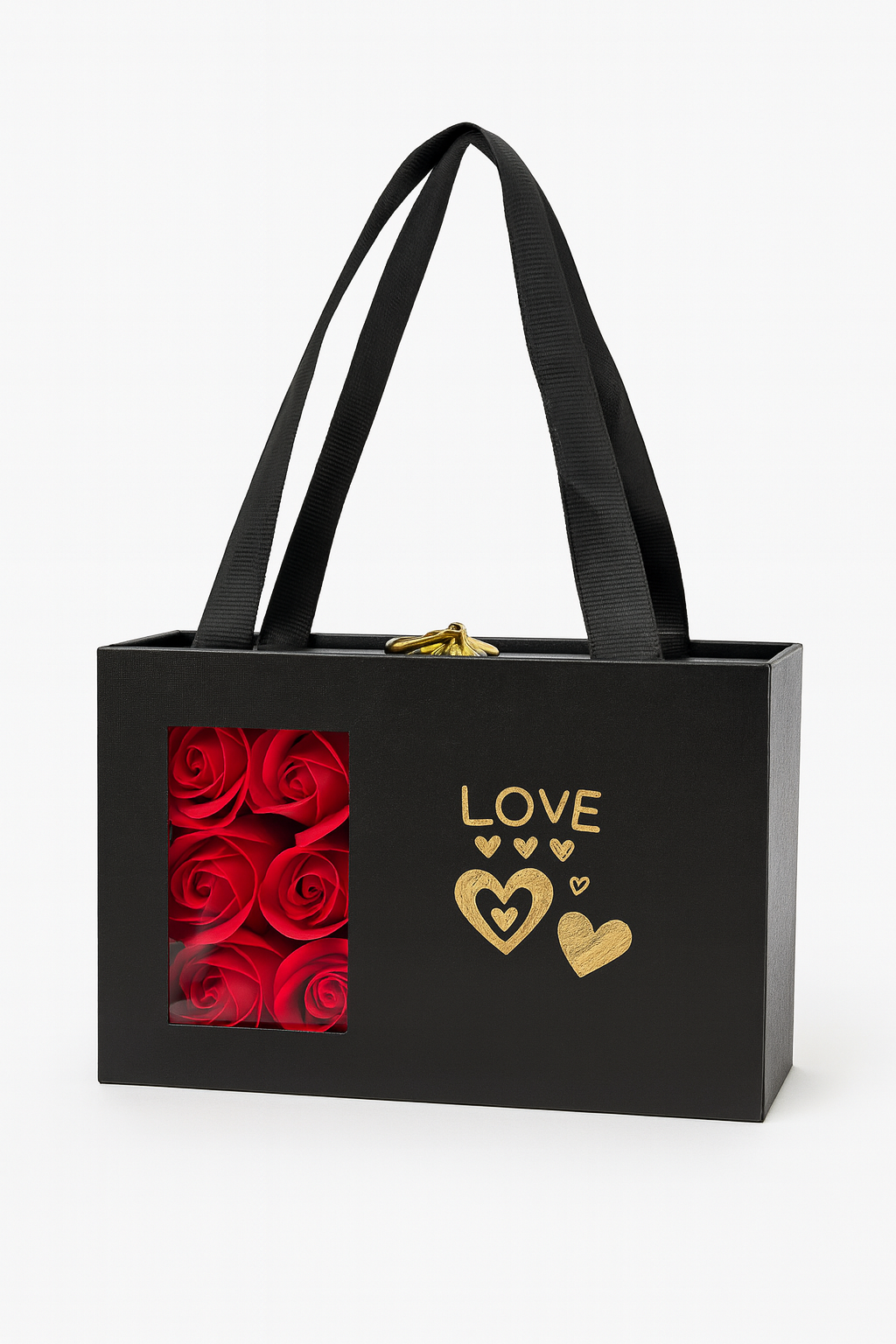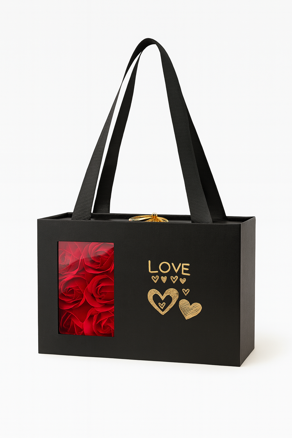 Setul este prezentat intr-o cutie rigida de culoare neagra, cu design tip poseta, prevazuta cu manere textile rezistente si fereastra transparenta pentru vizualizarea continutului. Decorul auriu cu mesajul LOVE si inimioare adauga un accent elegant si romantic, transformand cutia intr-un element de impact.