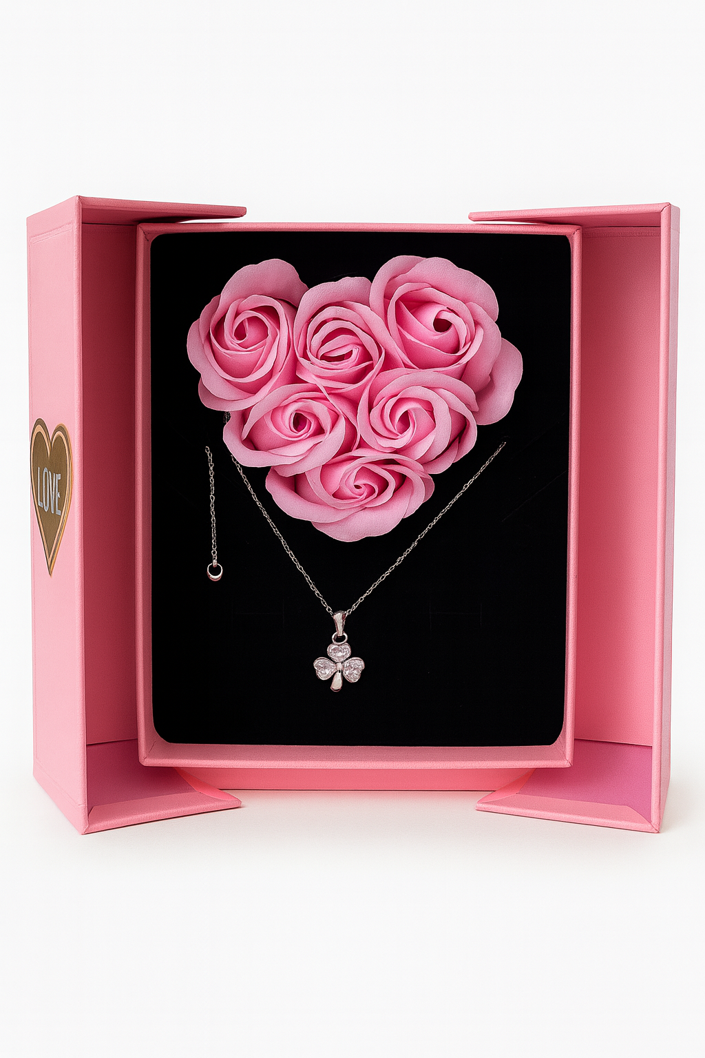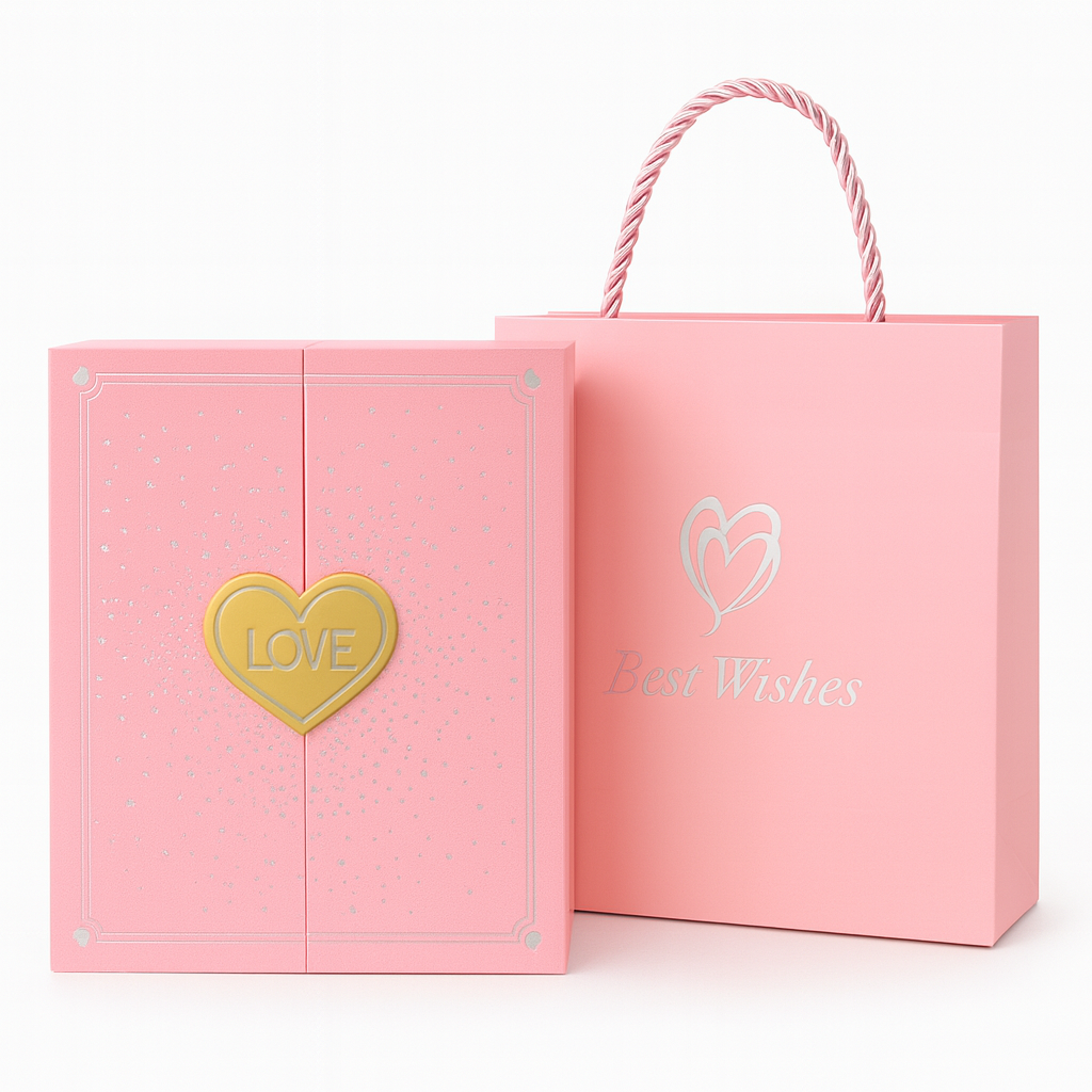 Cutia este rigida, tip carte, de culoare roz, decorata cu elemente grafice elegante si mesaj LOVE. Interiorul este atent compartimentat pentru a evidentia trandafirii de sapun si accesoriul inclus. Setul este livrat cu punga de cadou inclusa, fiind gata de oferit imediat.