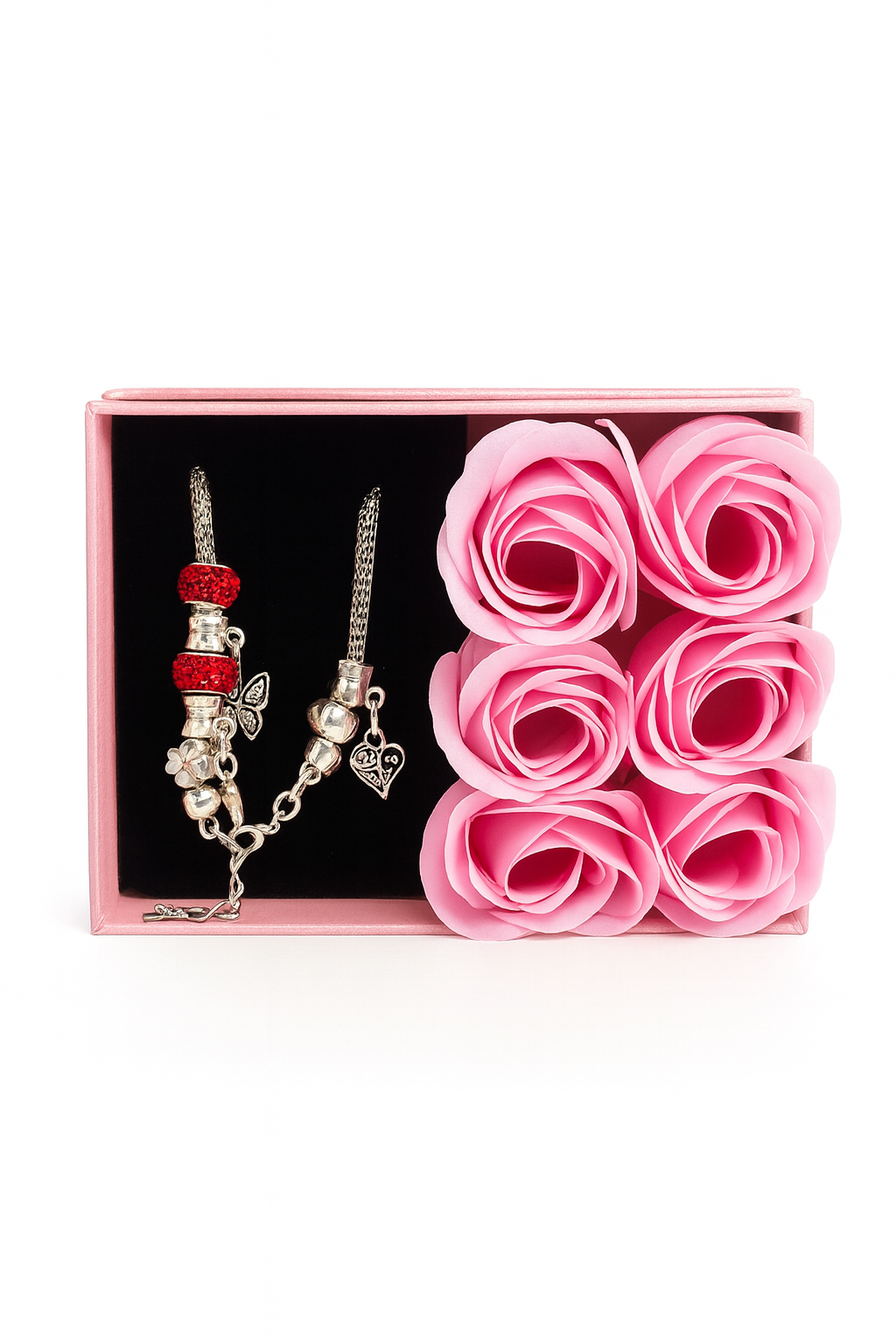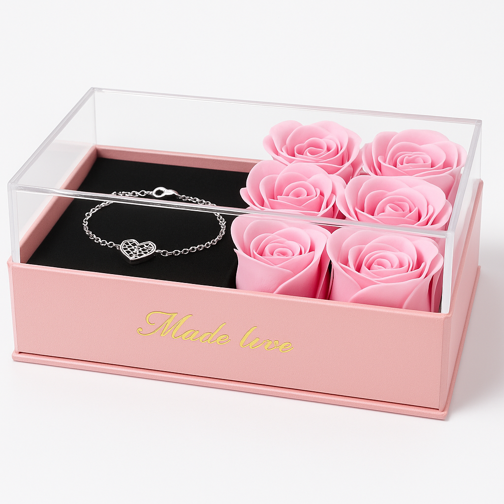 In compartimentul dedicat este inclusa o bratara decorativa, cu model diferit (gen aleator), ceea ce face fiecare set unic. Acest element adauga un plus de surpriza si exclusivitate, transformand cadoul intr-o experienta completa, nu doar un simplu obiect. Bratara completeaza perfect designul romantic al setului si poate fi purtata zilnic sau la ocazii speciale.