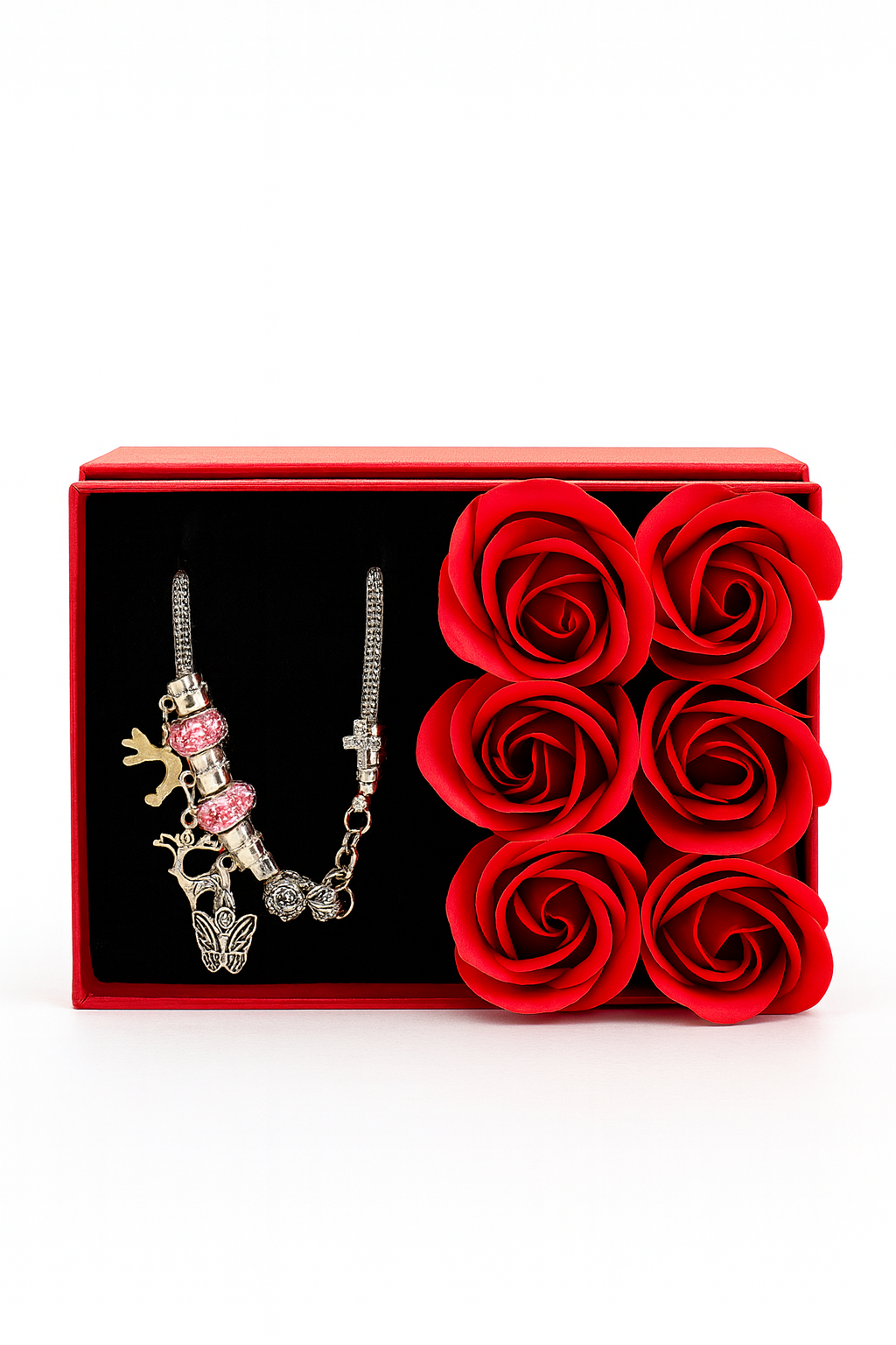 In compartimentul special este inclusa o bratara decorativa, cu model diferit (gen aleator), fiecare set fiind unic. Acest detaliu adauga un element de surpriza si exclusivitate, facand fiecare cadou special si personal. Bratara completeaza perfect conceptul romantic al setului si poate fi purtata zilnic sau la ocazii speciale.