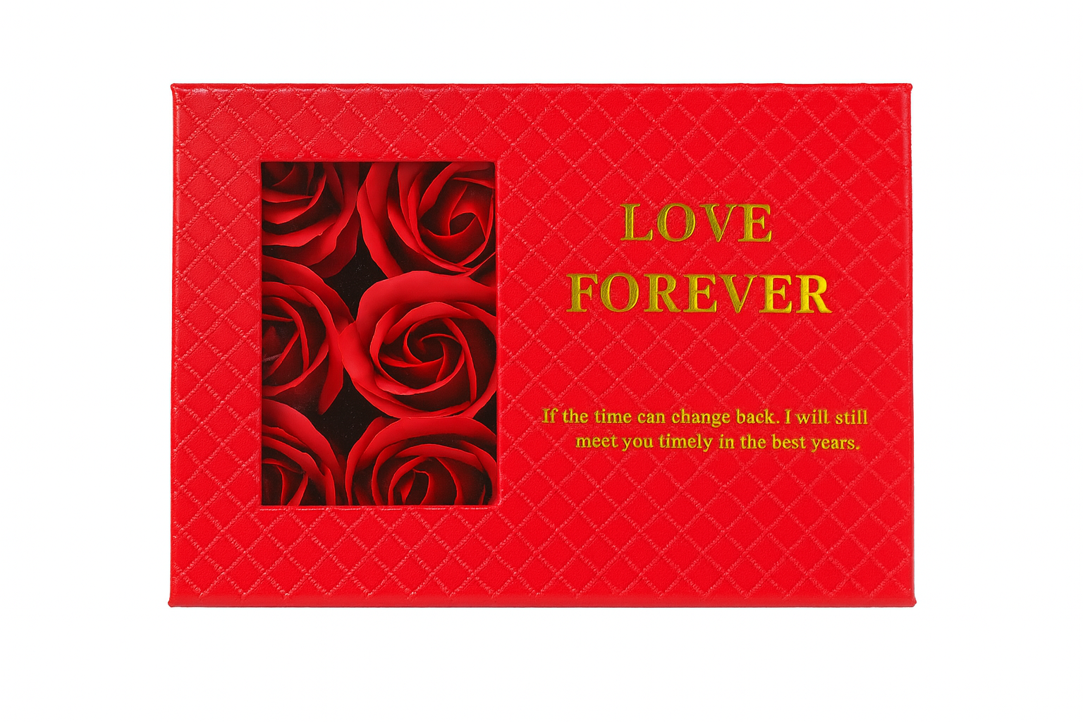 Trandafirii sunt asezati intr-o cutie premium roșu, cu capac decorativ si fereastra transparenta, inscriptionata elegant cu mesajul „Love Forever”. Designul sofisticat al cutiei transforma produsul intr-un cadou de impact, ideal pentru a fi oferit fara ambalare suplimentara. Interiorul este conceput pentru a pune in valoare florile si pentru a crea un efect vizual elegant si armonios.