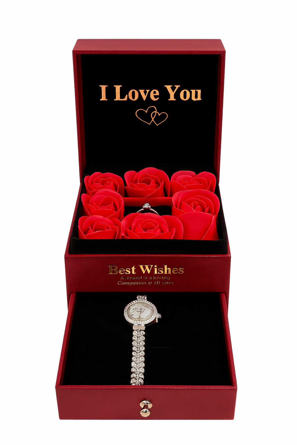 Partea inferioara a cutiei include un sertar glisant elegant, in care este asezat un ceas de dama, cu design rafinat si detalii stralucitoare. Ceasul completeaza perfect setul, adaugand un element practic si sofisticat, ideal pentru femeile care apreciaza accesoriile elegante si functionale.