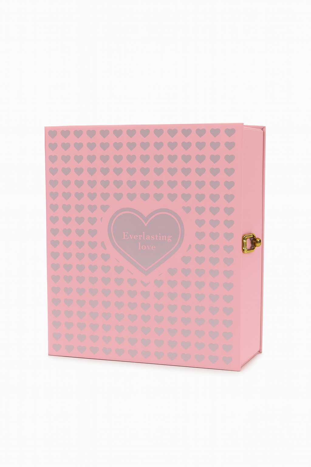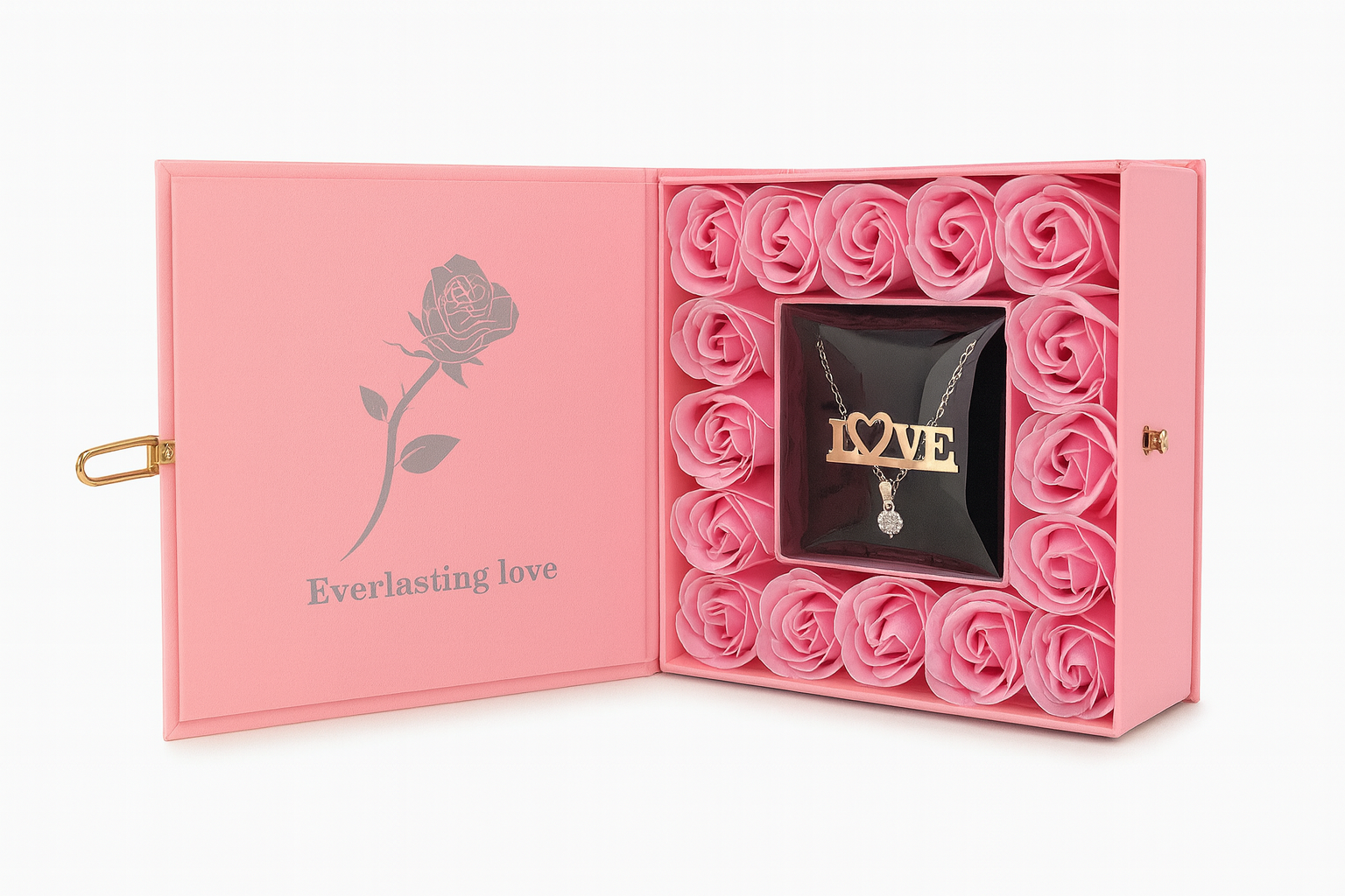 Cutia rigida roz, cu finisaje premium si inchidere eleganta, este decorata cu simbolul trandafirului si inscriptia „Everlasting love”, exprimand sentimente sincere si durabile. La deschidere, interiorul dezvaluie un aranjament armonios de trandafiri decorativi roz, asezati uniform pentru un impact vizual spectaculos si un aer romantic.