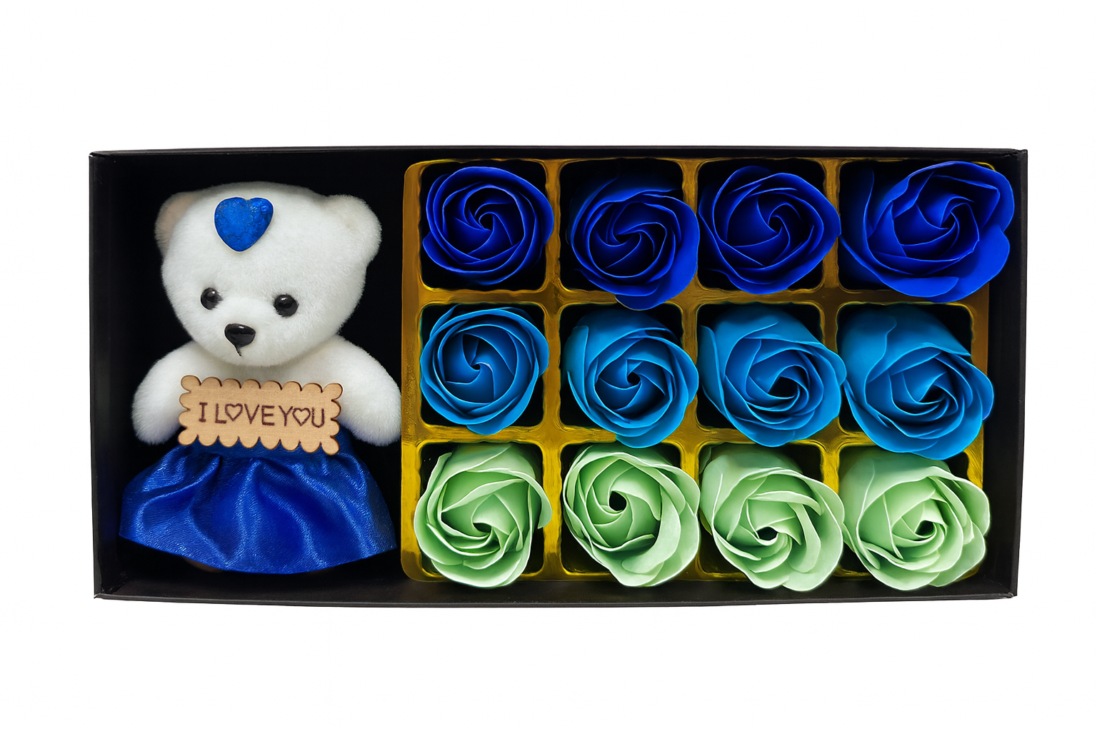 Setul include un ursulet decorativ delicat, cu mesajul „I Love You”, simbol al afectiunii si al iubirii sincere, alaturi de 12 trandafiri din sapun dispusi armonios intr-o cutie eleganta. Trandafirii, realizati din sapun decorativ de calitate superioara, au un aspect extrem de realist, petale fine si culori intense, oferind un efect vizual premium si sofisticat.