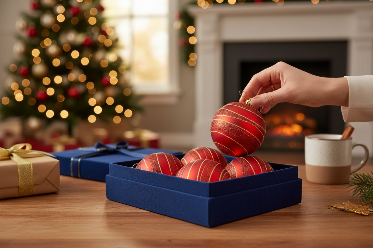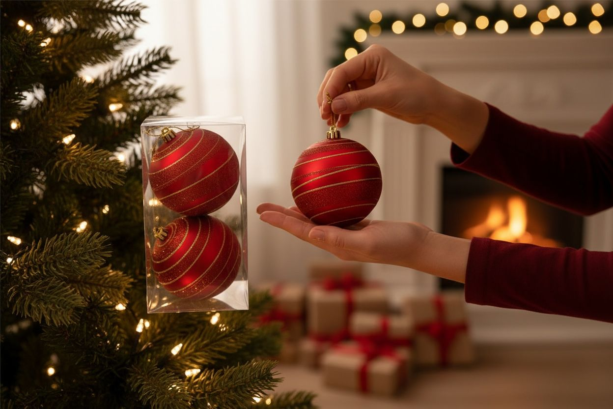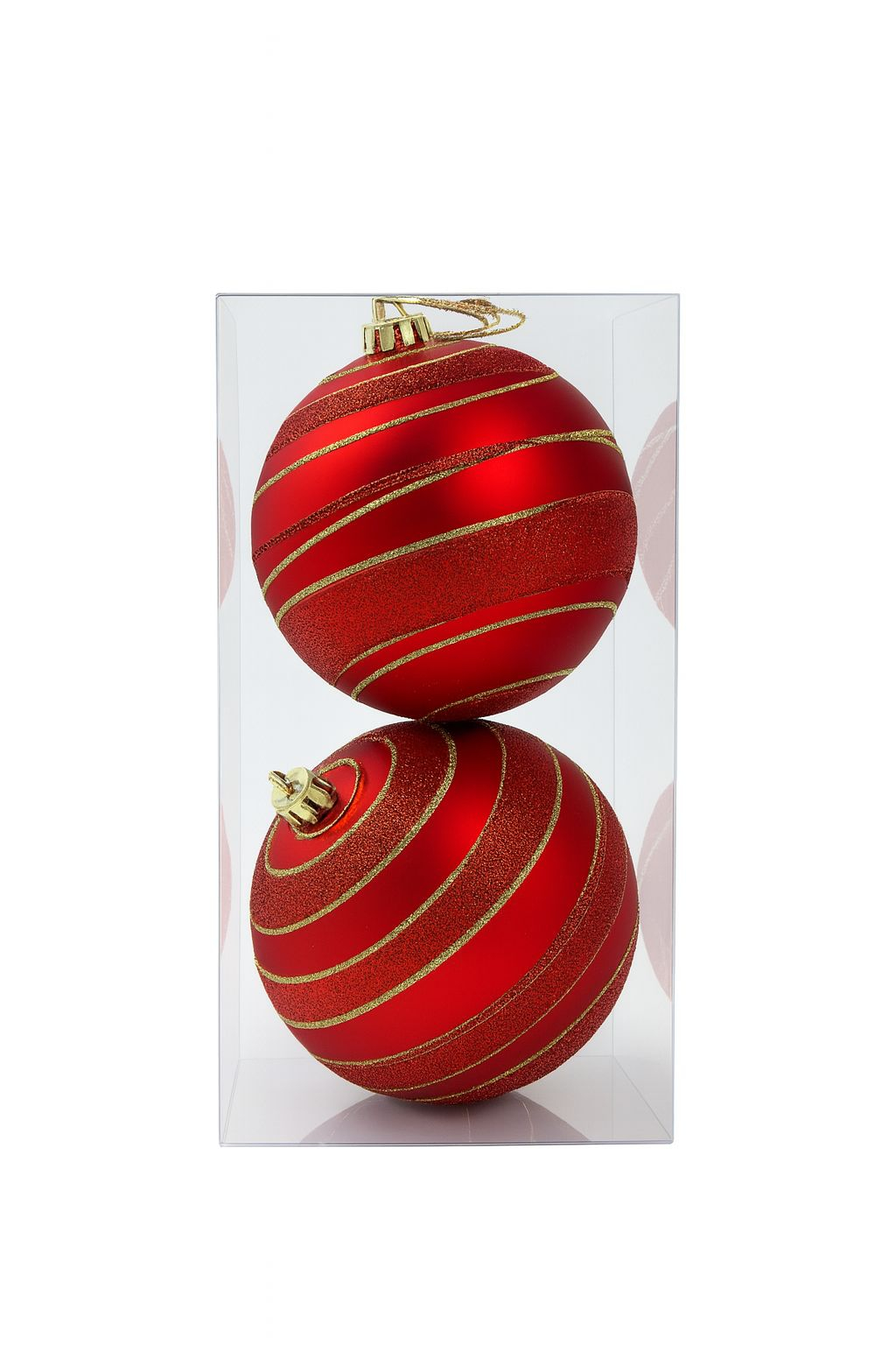 Set format din 2 globuri de Craciun rosii, cu model spiralat si insertii fine de sclipici auriu. Globurile sunt ambalate intr-o cutie transparenta, perfecte pentru cadou sau pentru completarea decorului de sarbatori.