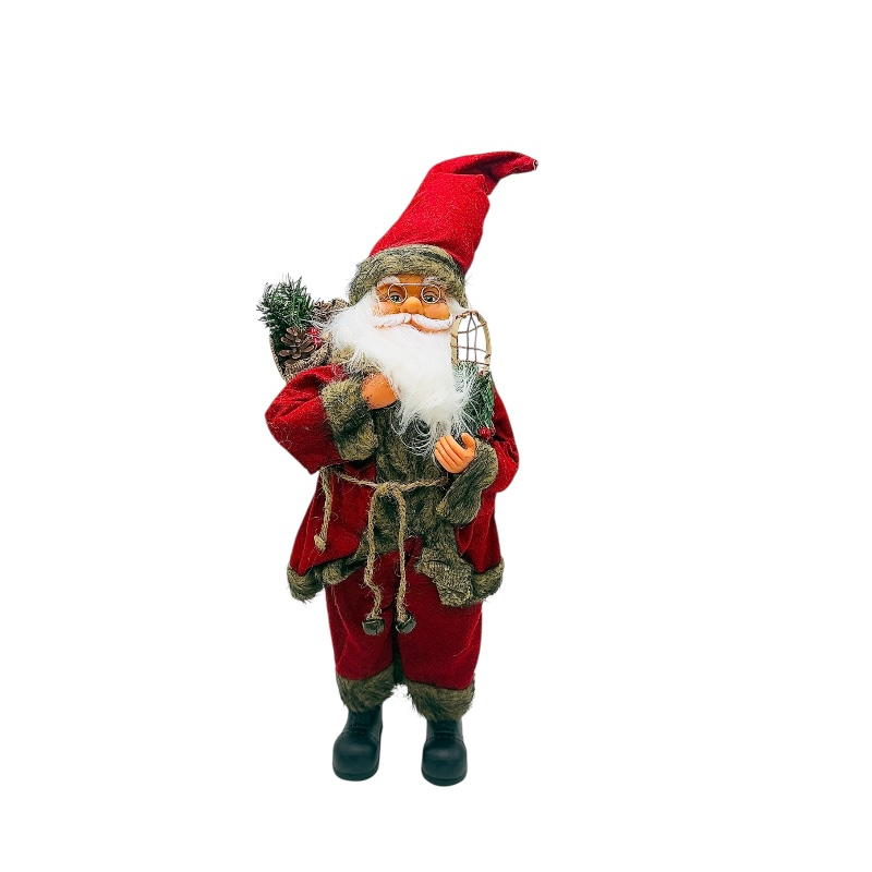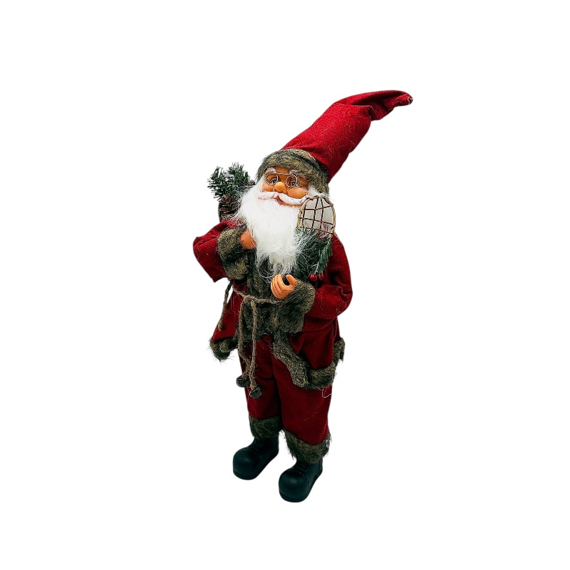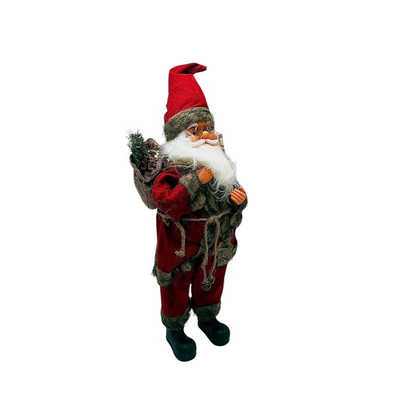 - Mos Craciun imbracat in rosu rustic cu detalii verzi si blanita fina.