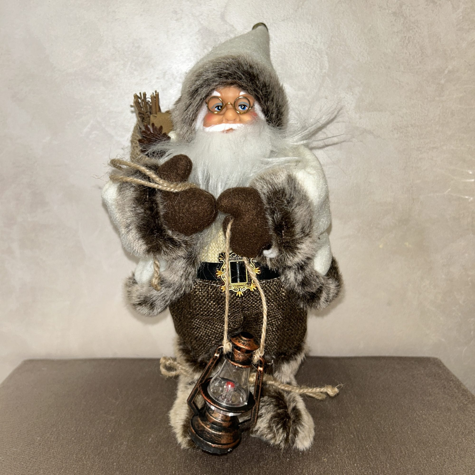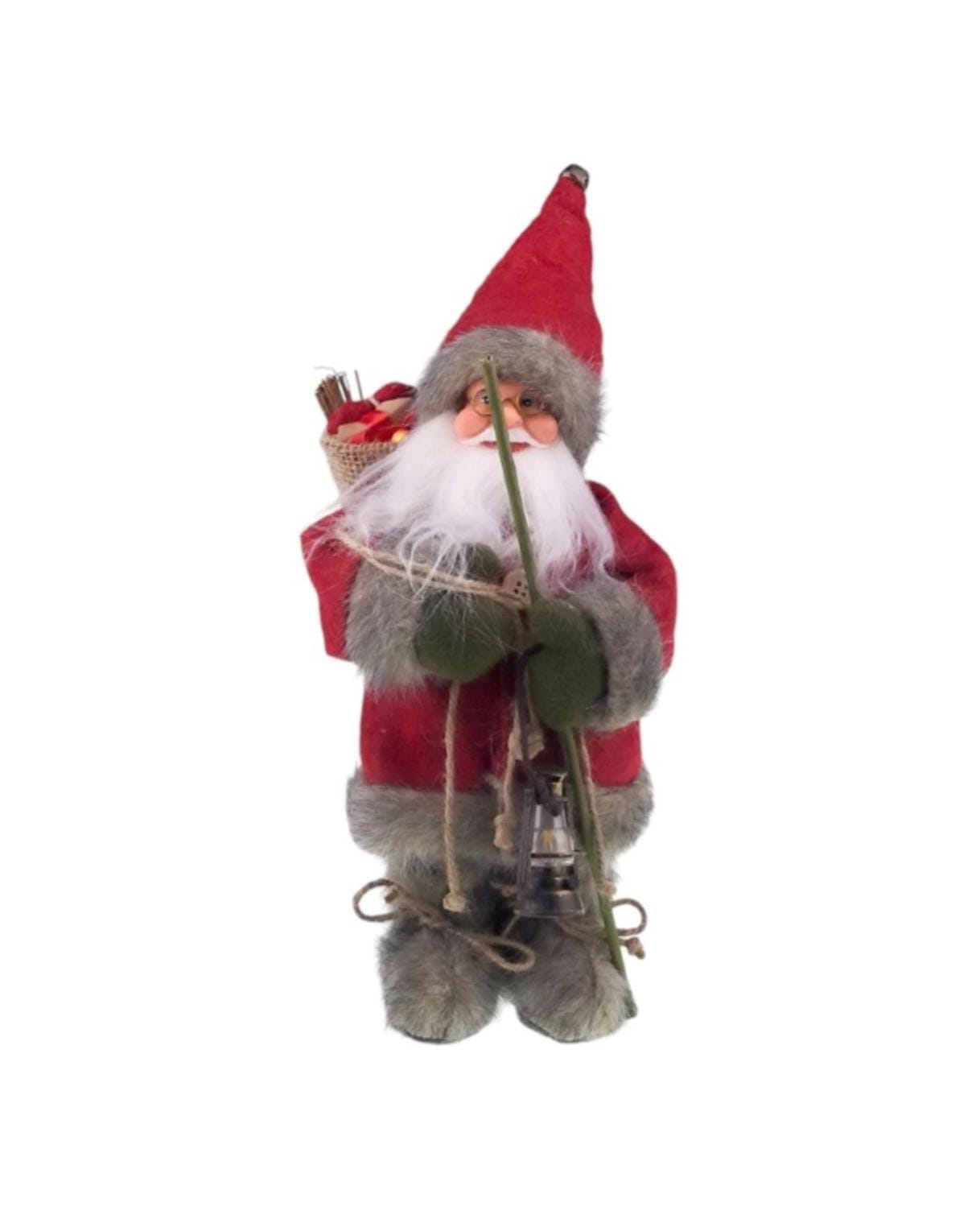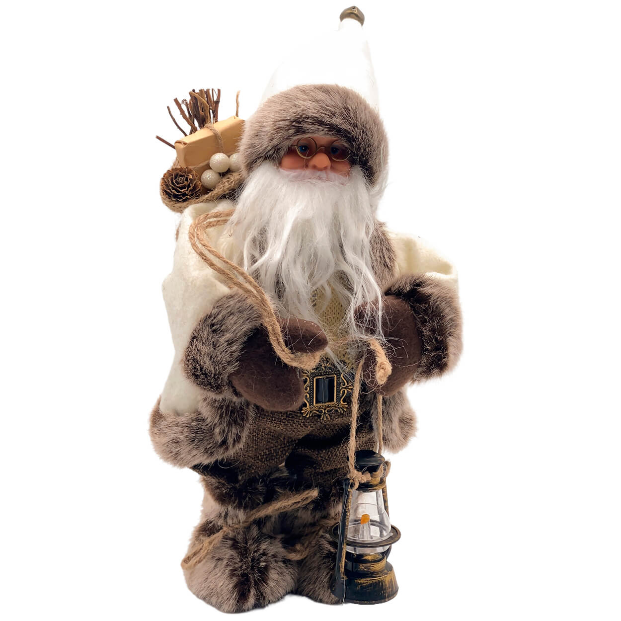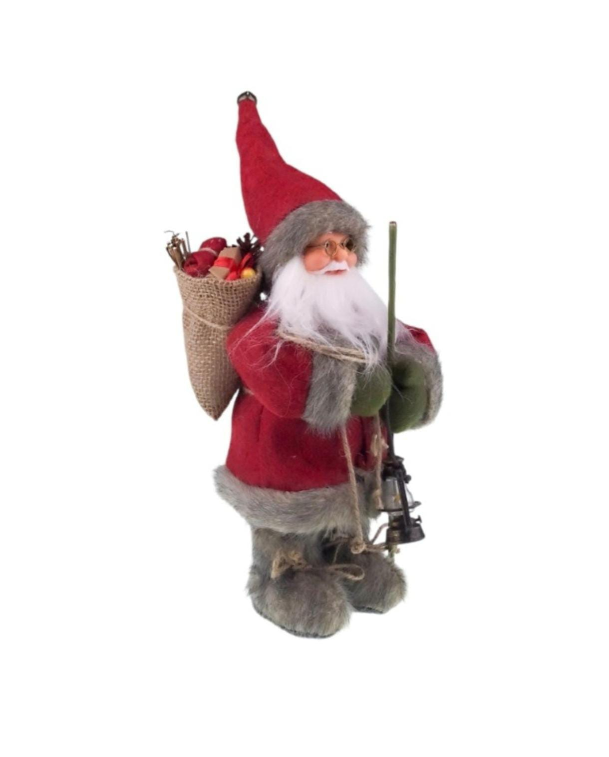 Set 2 Mos Craciun decorativi 35 cm – rosu + crem, stil rustic, cu felinar si sac