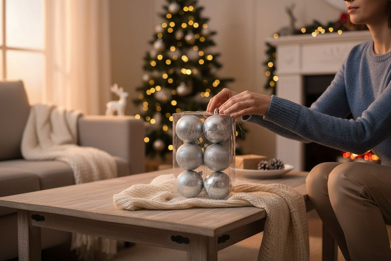 Set de 6 globuri argintii cu finisaj texturat si aplicatii fine de sclipici, perfecte pentru un decor modern si elegant de Craciun. Globurile au modele discrete in relief, care reflecta frumos lumina si aduc un plus de stralucire bradului sau aranjamentelor festive.