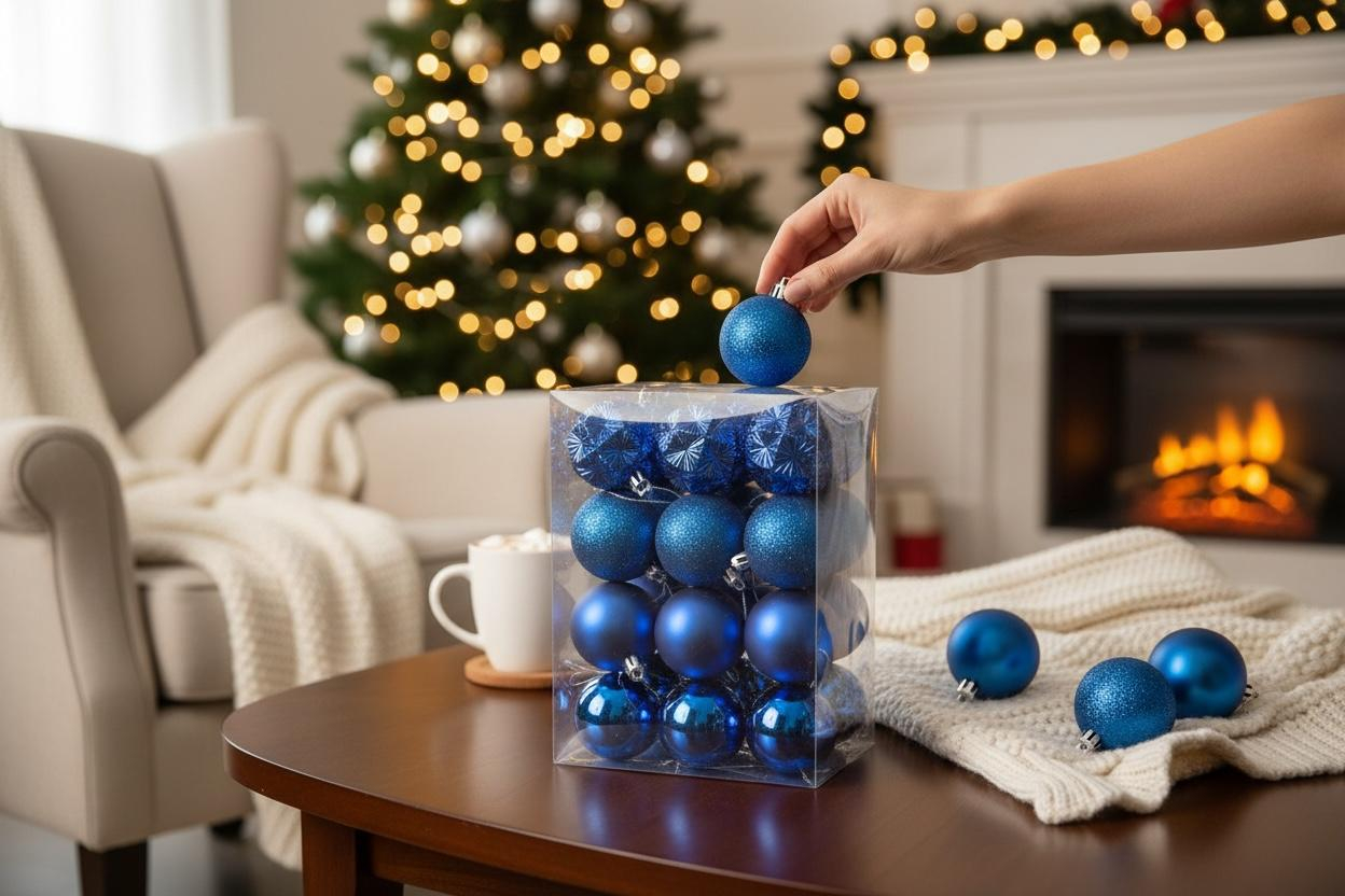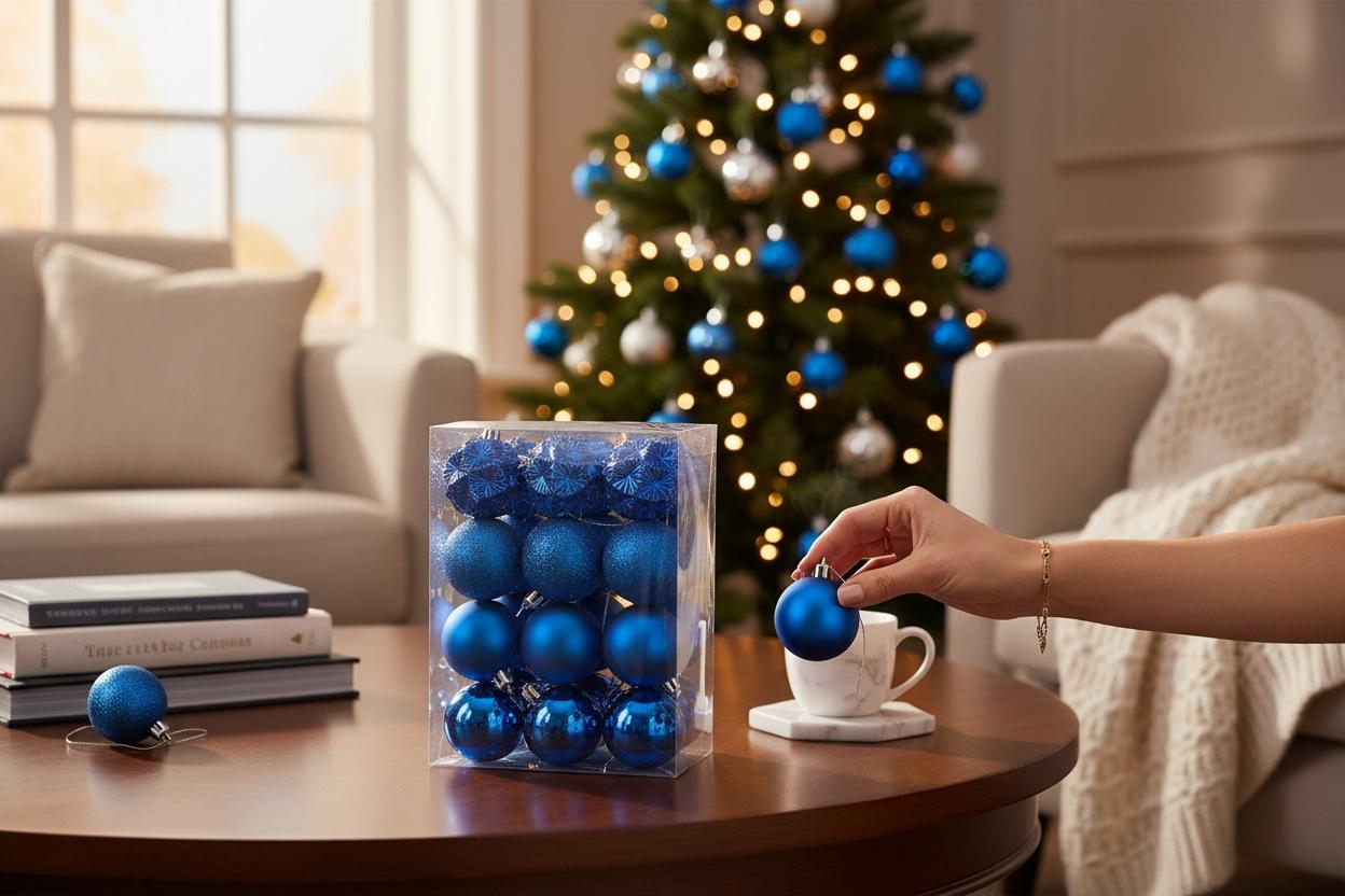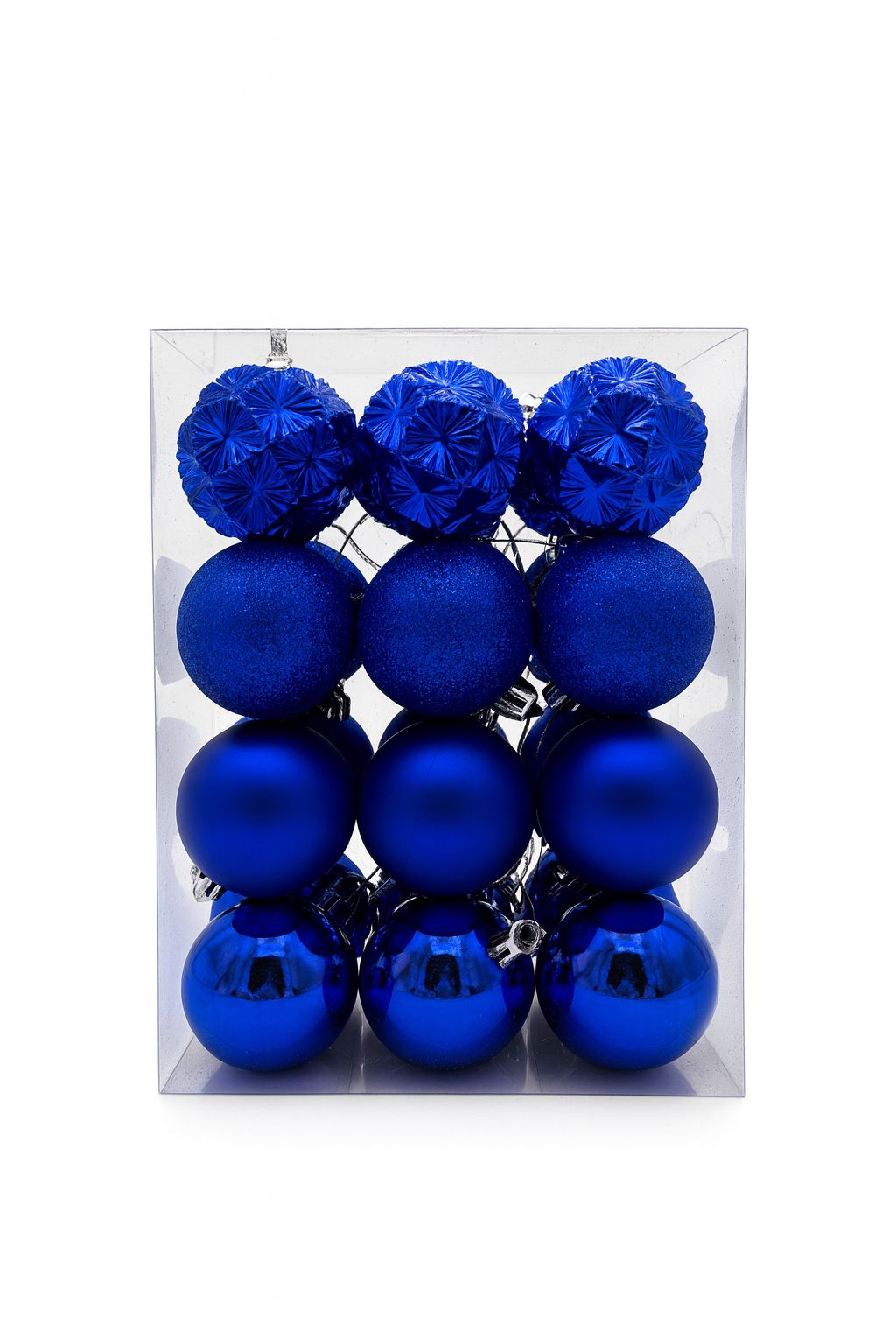 Set de 24 globuri albastre pentru bradul de Craciun, in nuante intense, perfecte pentru un decor elegant si modern. Globurile sunt ambalate in cutie transparenta, usor de depozitat sau oferit cadou.