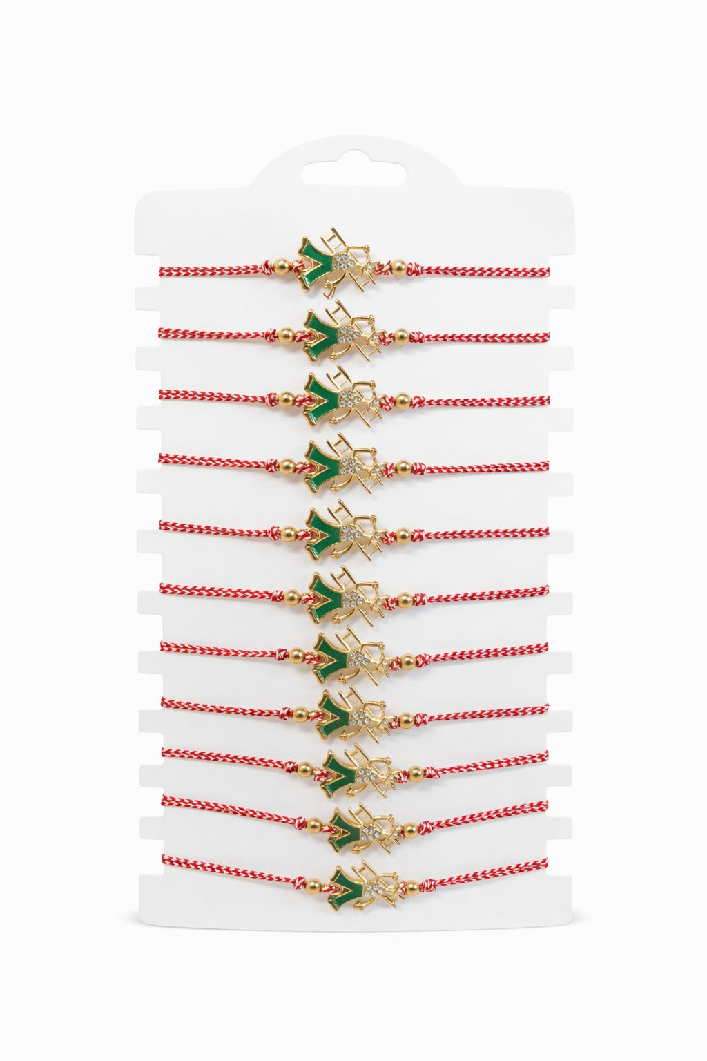Acest set de 12 bratari martisor este decorat cu un simbol traditional si plin de semnificatie – cosarul norocos cu scara, realizat in nuanta aurie, cu accente verzi si detalii fine, montat pe snur clasic de martisor alb cu rosu, impletit si reglabil. Bratarile sunt prezentate pe card tip display, cu dimensiunea de aproximativ 20 x 11 cm, fiind ideale pentru oferirea martisoarelor intr-un mod ordonat si elegant.