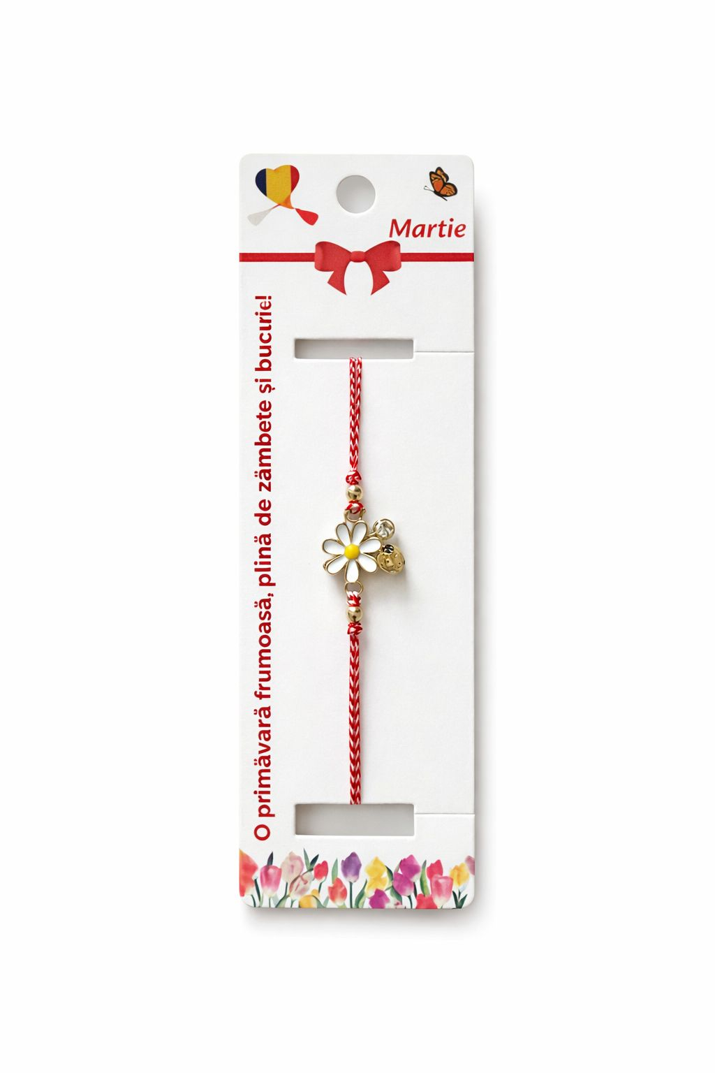 Fiecare bratara este realizata cu snur impletit rosu si alb, reglabil, usor de adaptat pe diferite dimensiuni ale incheieturii. Elementul central este o margareta decorativa, cu petale fine si detalii atent finisate, completata de mici accesorii metalice care adauga un plus de eleganta si rafinament. Sistemul de ajustare permite purtarea confortabila, bratara putand fi folosita atat ca martisor, cat si ca accesoriu discret de zi cu zi.
