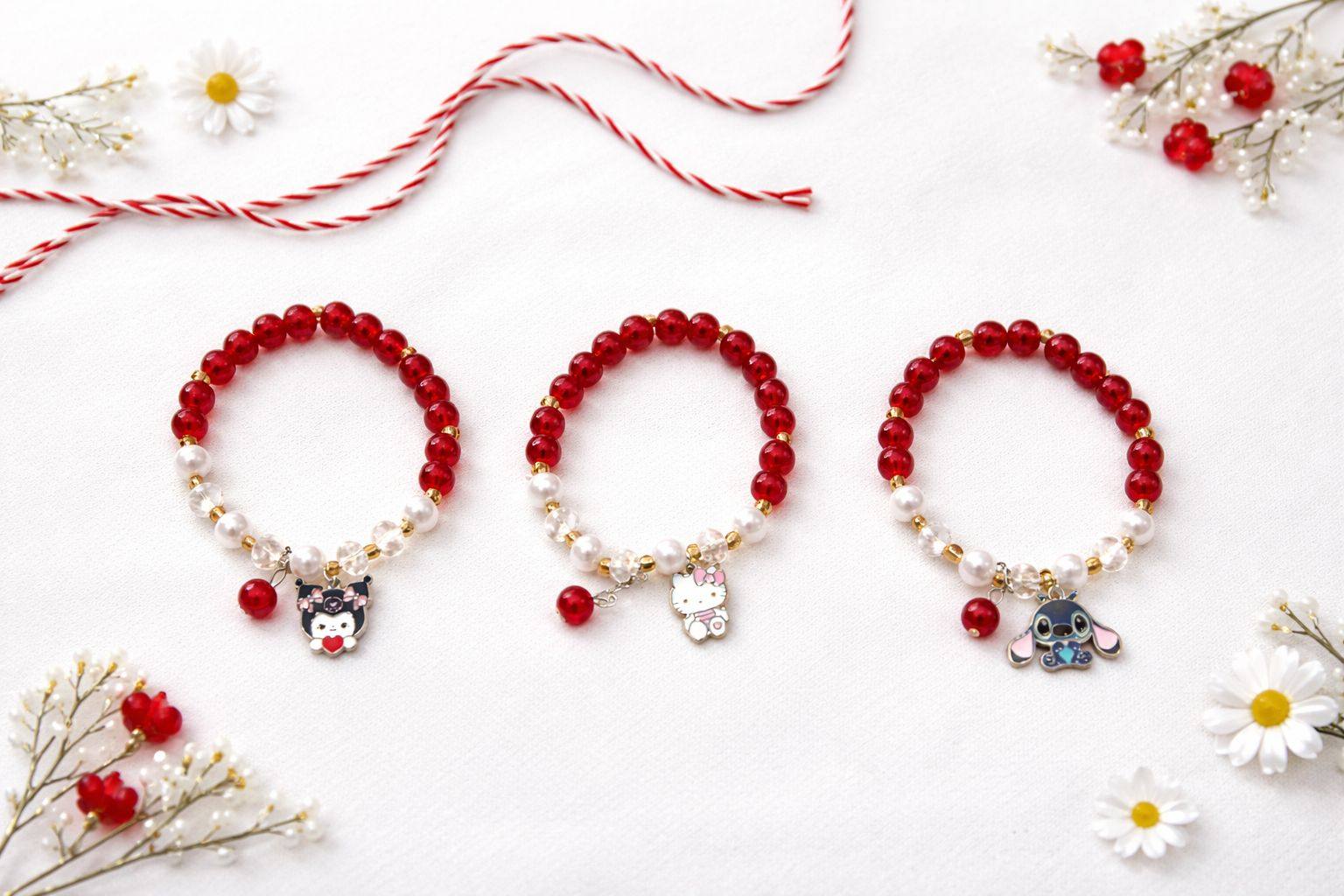 Set 12 bratari martisor elastice cu margele alb rosu si figurine simpatice, ideale pentru 1 Martie.