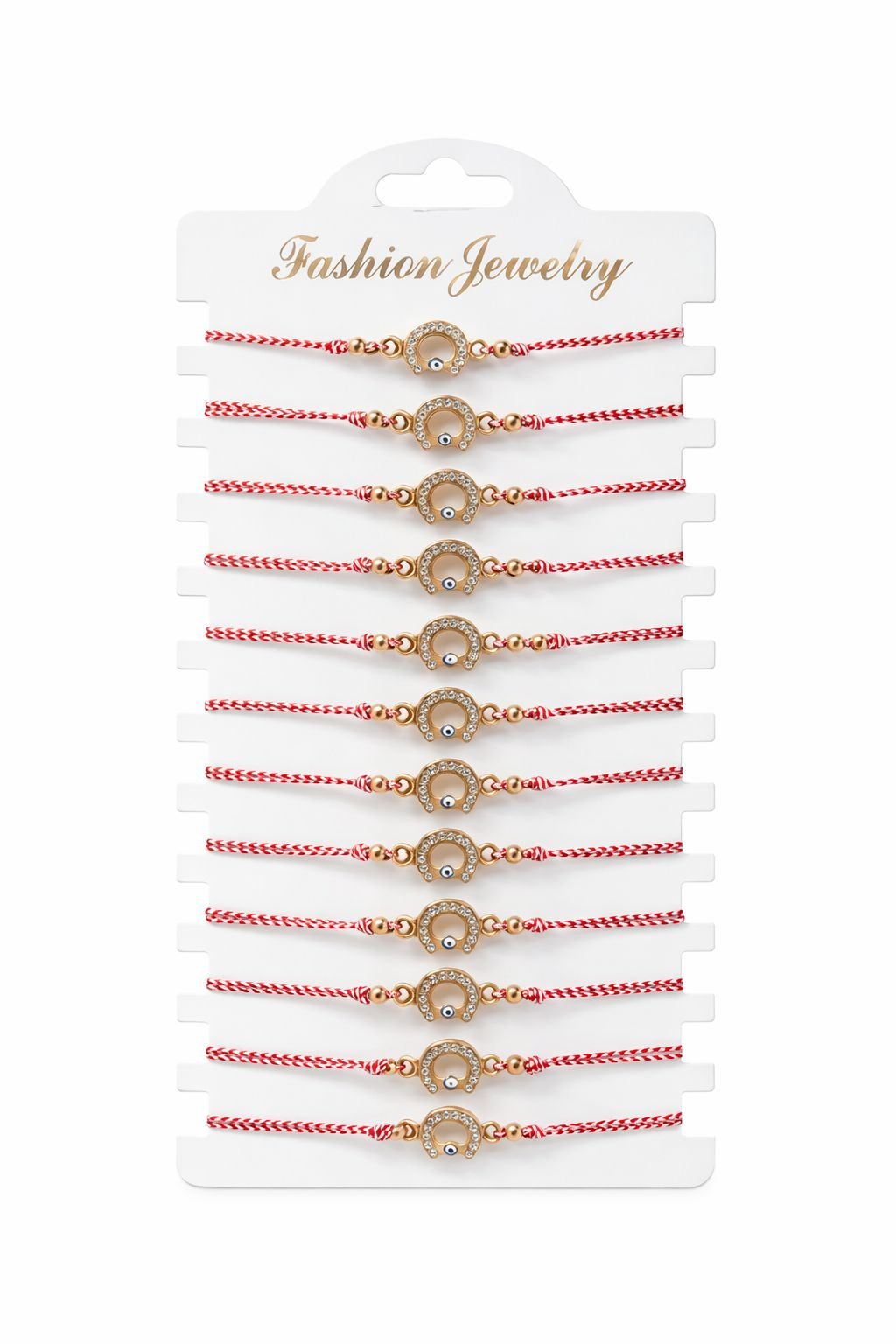 Acest set de 12 bratari martisor este decorat cu un simbol traditional al norocului si protectiei – potcoava aurie, impodobita cu strasuri stralucitoare si ochisor protector, montata pe snur traditional rosu impletit, reglabil. Bratarile sunt prezentate pe card de tip display, cu dimensiunea de aproximativ 20 x 11 cm, fiind ideale pentru oferirea martisoarelor intr-o forma organizata si eleganta.