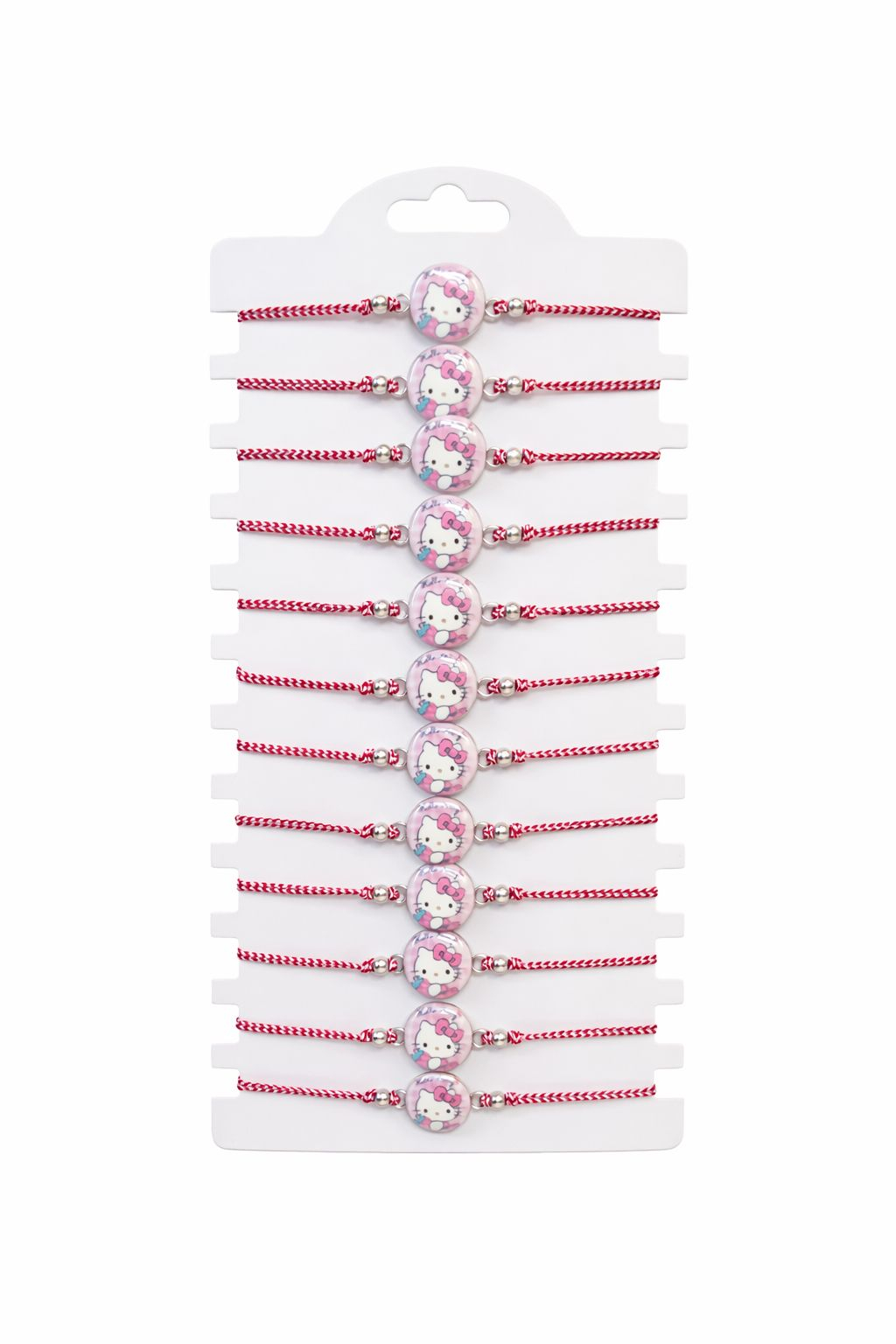 Adu un zambet pe chipul celor mici cu acest set 12 bratari Martisor reglabile, Hello Kitty. Personajul iconic adauga o nota de veselie snurului rosu traditional, transformand martisorul intr-un accesoriu pe care copiii il vor purta cu mare drag.