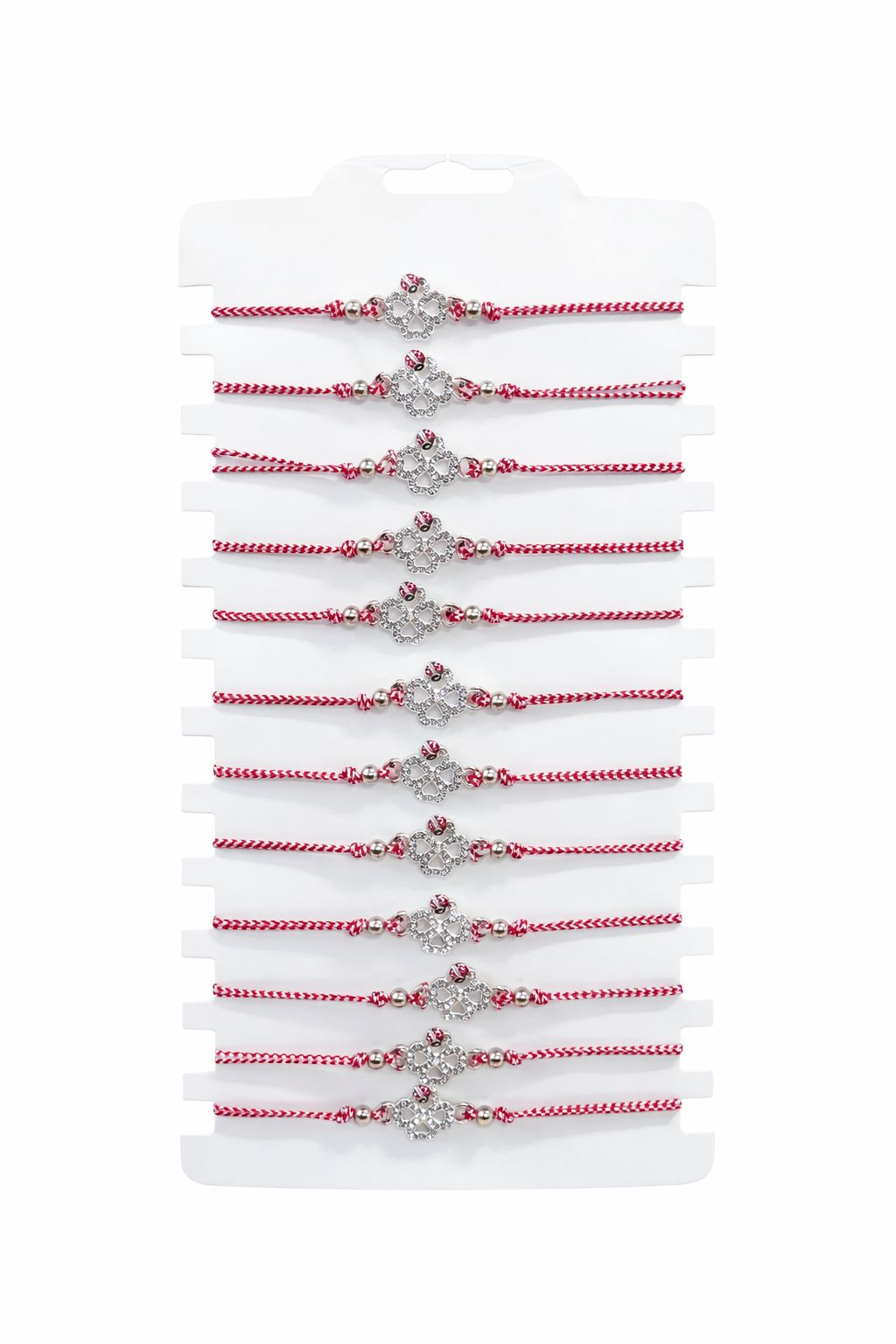 Ofera un simbol autentic al norocului cu acest set 12 bratari Martisor reglabile, Trifoi cu gargarita. Fiecare bratara este lucrata cu atentie, imbinand snurul rosu traditional cu un element decorativ ce aduce impreuna doua simboluri puternice ale primaverii.