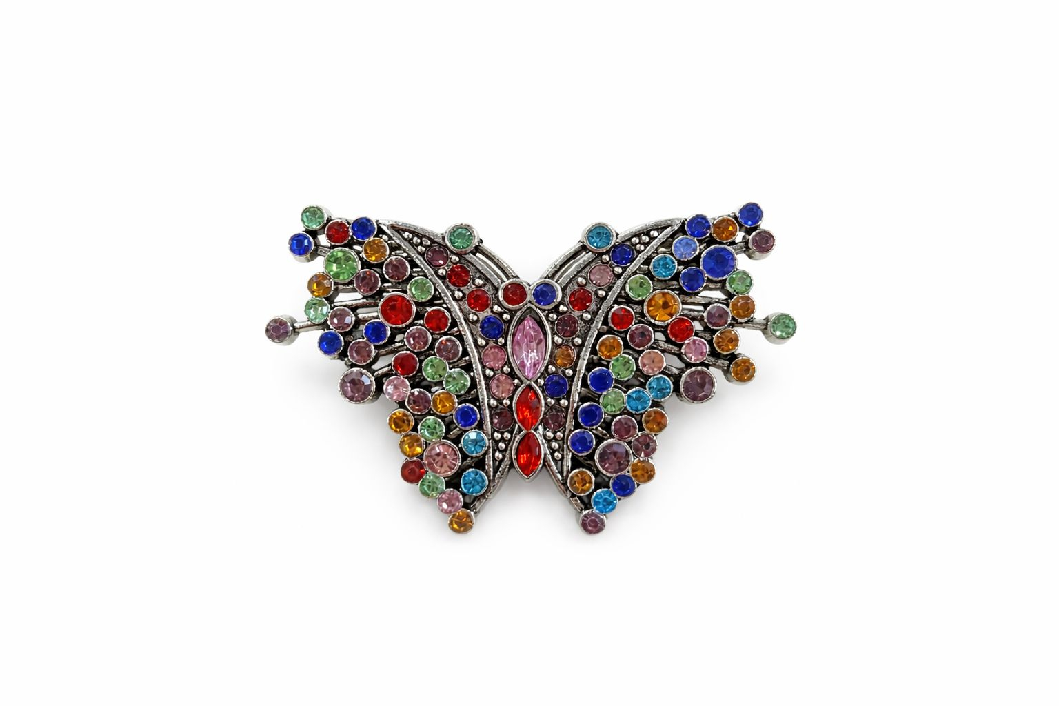 Aceasta brosa decorativa, cu dimensiunea de aproximativ 5 x 3 cm, are forma unui fluture elegant, cu finisaj argintiu (sau metal comun) si detalii rafinate. Aripile sunt impodobite cu o multitudine de cristale si strasuri multicolore (rosu, albastru, verde, roz, mov), care capteaza lumina si ofera un aspect vibrant si sofisticat. Designul evoca feminitatea, transformarea si libertatea, fiind ideal ca martisor, accesoriu vestimentar pentru ocazii speciale (nunti, petreceri, baluri) sau cadou de 1 si 8 martie. Prinderea este de tip brosa, sigura si usor de prins la rever, esarfa, palarie sau pe geanta, fiind un accesoriu versatil ce aduce un plus de rafinament oricarei tinute.