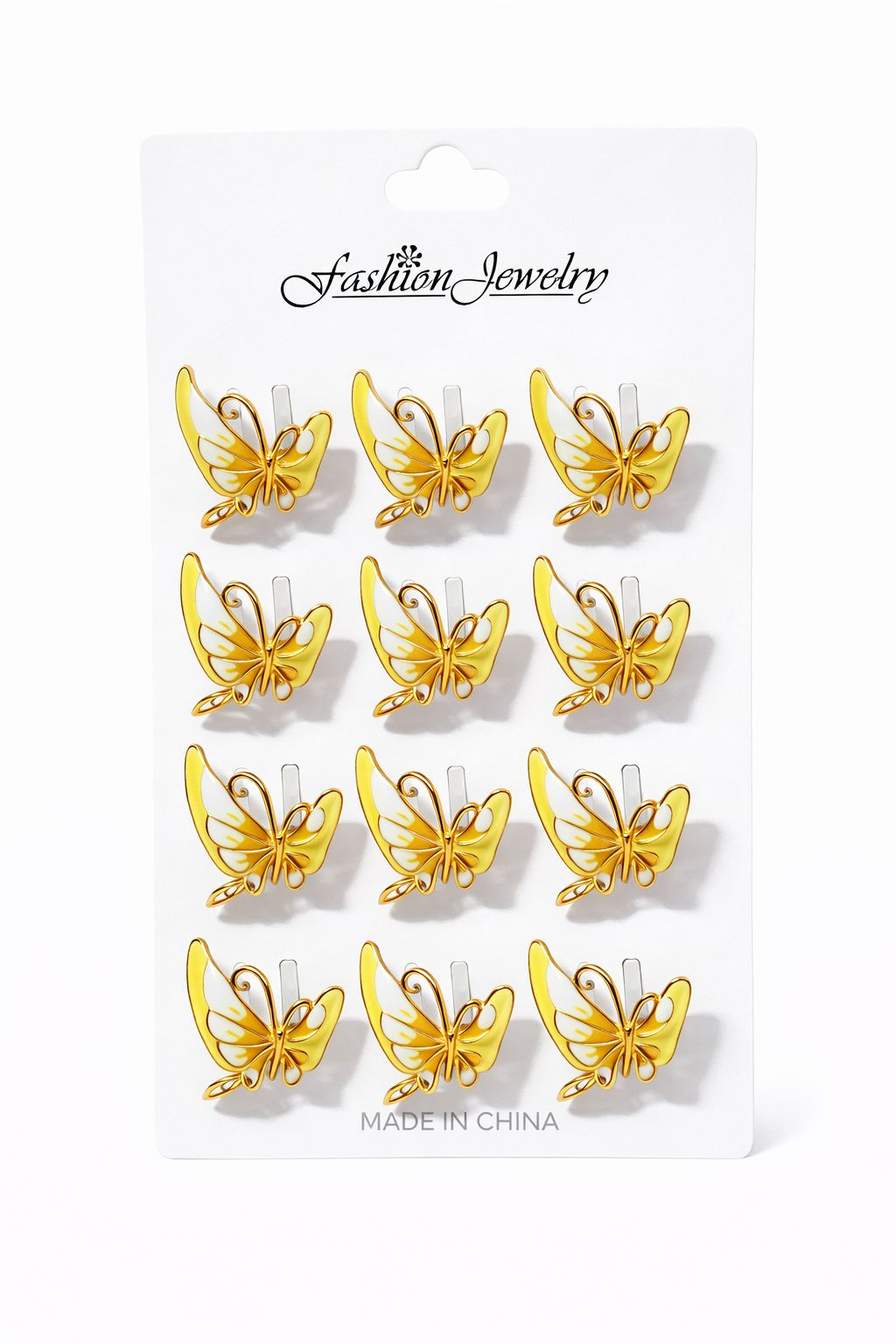Set de 12 brose martisor cu model delicat de fluture auriu, simbol al transformarii, libertatii si noilor inceputuri. Fluturele este asociat cu schimbarea pozitiva, evolutia personala si frumusetea primaverii, fiind un simbol potrivit pentru martisor si pentru urari de bine.