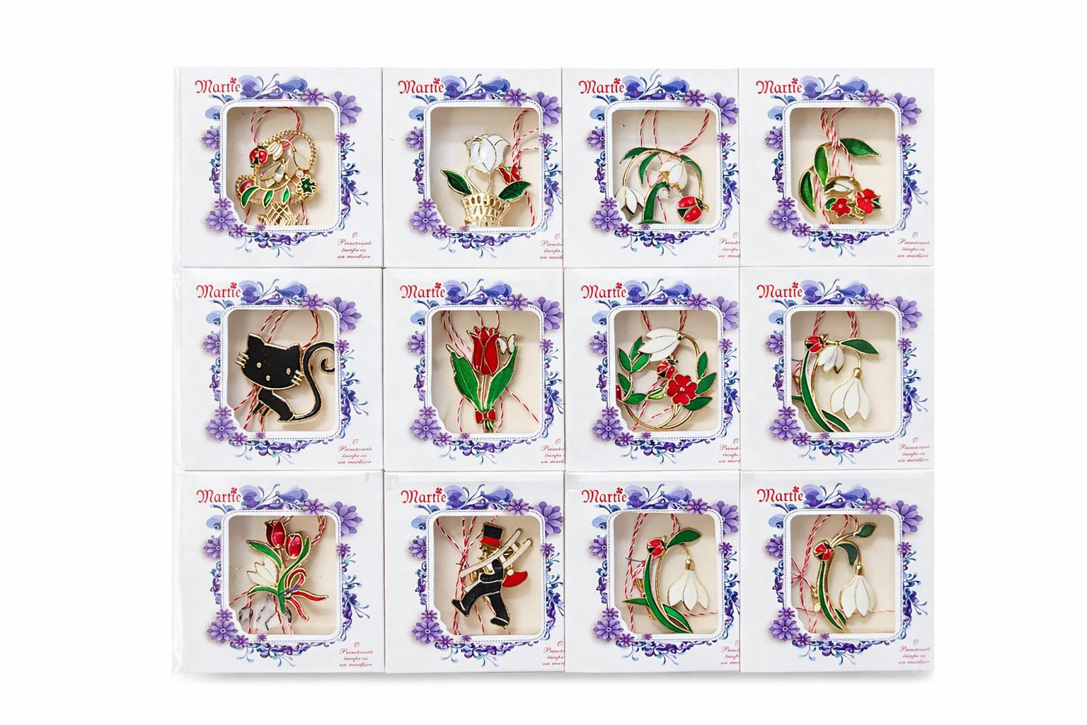 Modelele variate includ simboluri florale, elemente traditionale si decorative, fiecare purtand un mesaj pozitiv de bucurie, speranta, iubire, protectie si prosperitate. Diversitatea broselelor permite oferirea unor martisoare diferite, potrivite pentru mai multe persoane, pastrand in acelasi timp unitatea simbolica a sarbatorii.