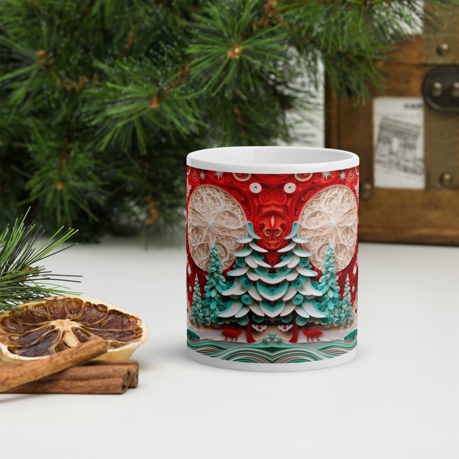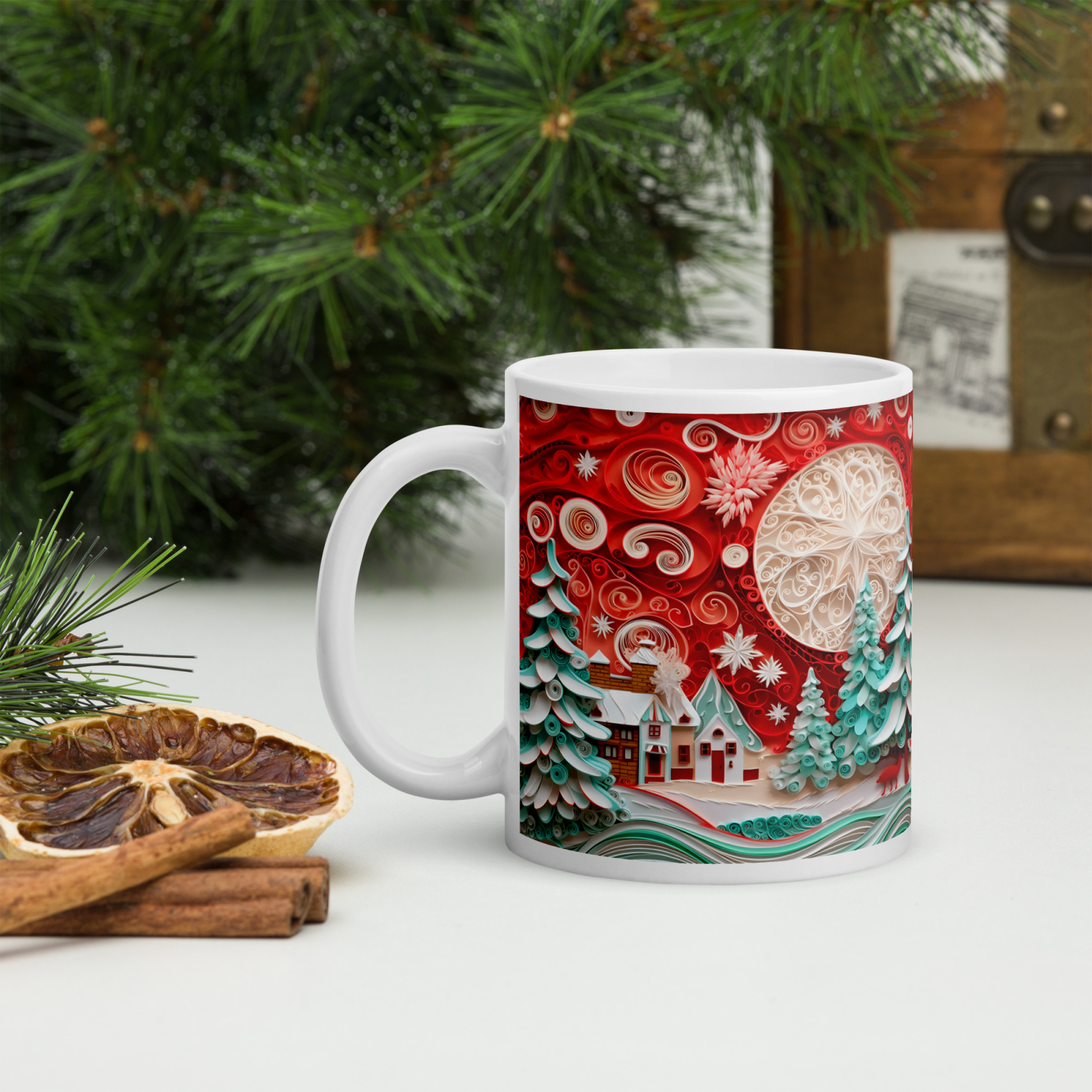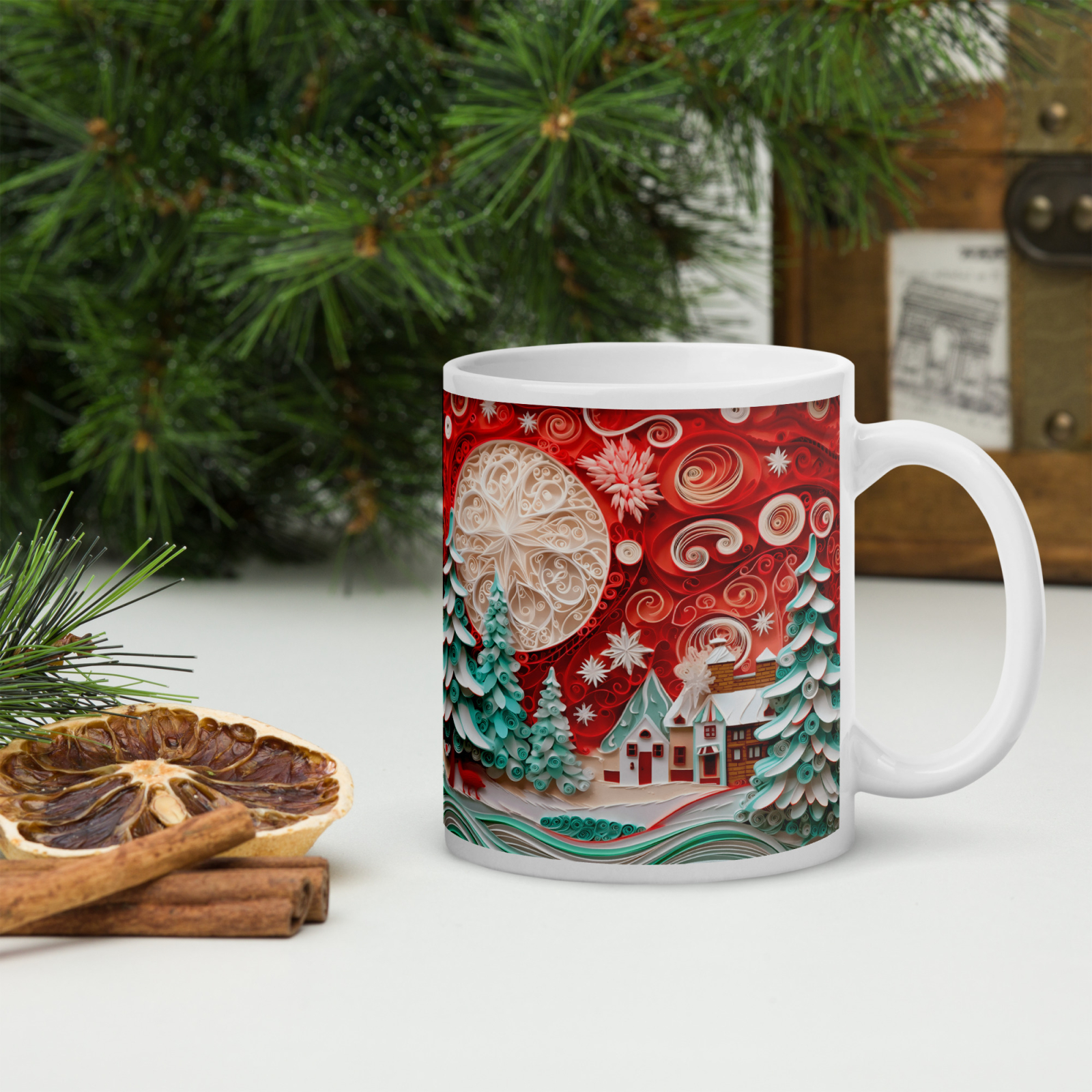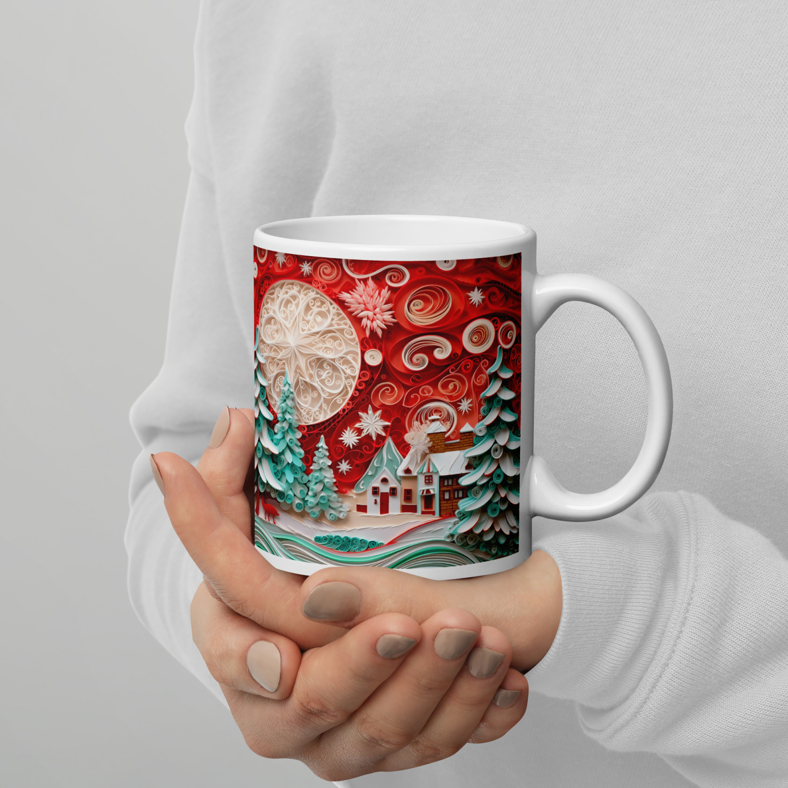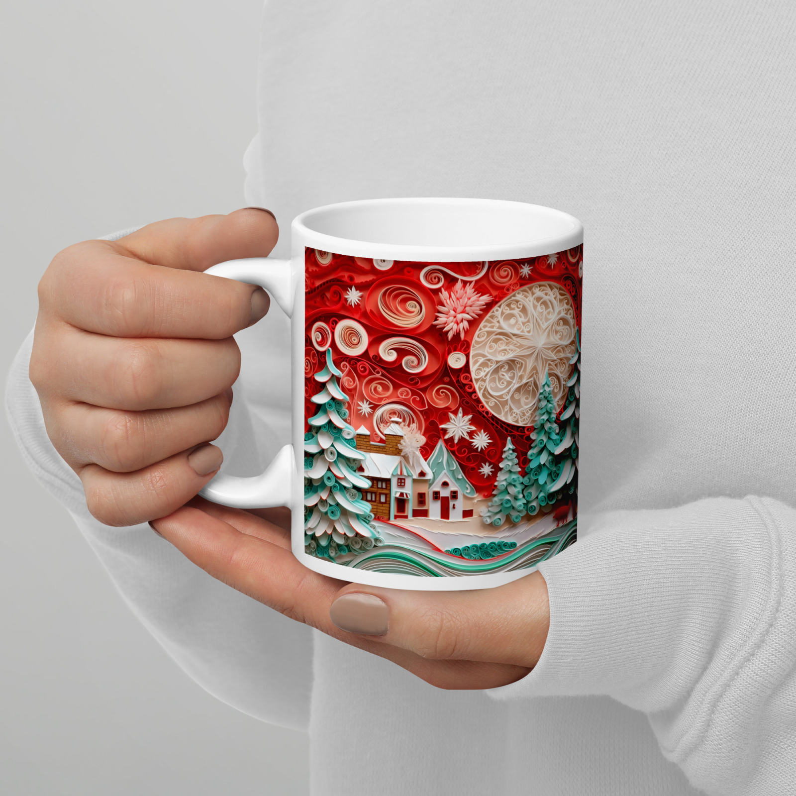 Cana din ceramică de 11 oz / 330 ml aduce o notă festivă oricărei pauze de cafea. Finisajul lucios, marginea confortabilă și mânerul ergonomic asigură o experiență plăcută de utilizare în sezonul rece.
