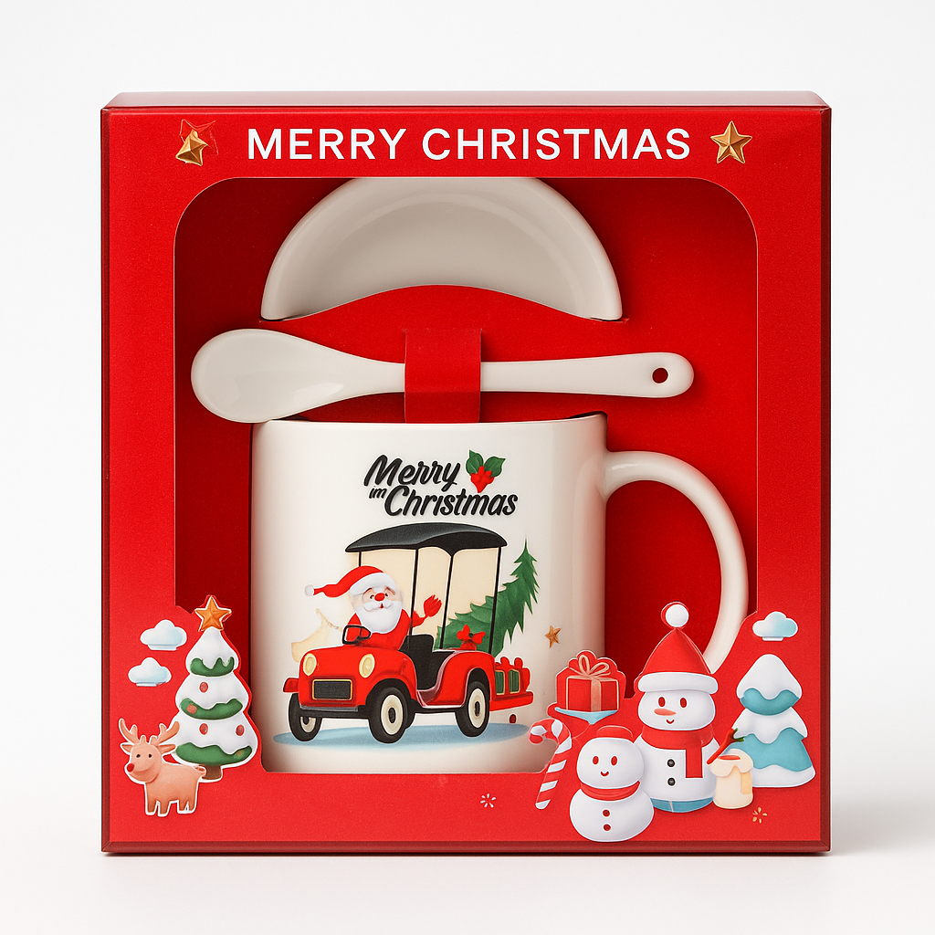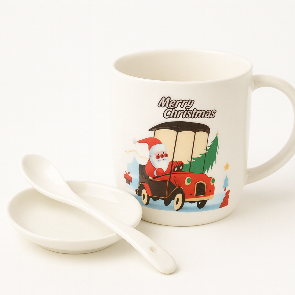 Set Cana Ceramica cu Lingurita si Farfuriuta, Tematica de Craciun, în Cutie Cadou –17.5x15x9cm