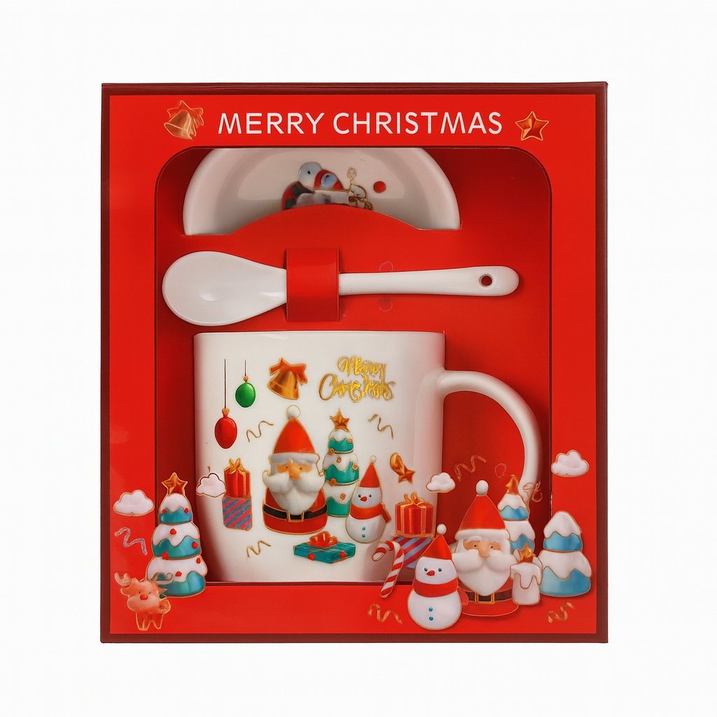 Adu magia sarbatorilor direct in casa ta cu acest set festiv de Craciun, format din cana ceramica premium, lingurita si farfurioara, perfect ambalate intr-o cutie cadou eleganta si colorata. Designul vesel cu Mos Craciun, braduti impodobiti, cadouri si decoratiuni de iarna transforma fiecare moment de relaxare intr-o experienta calda si plina de atmosfera.