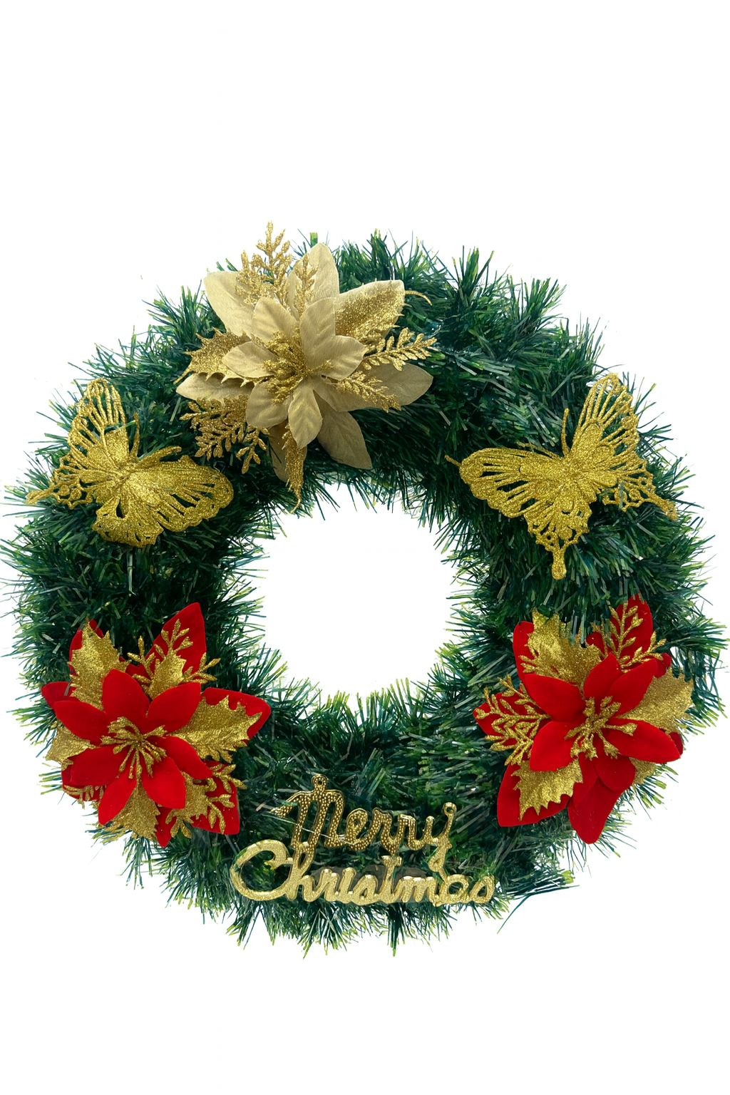 Adauga un plus de farmec sarbatorilor cu aceasta corona decorativa de Craciun, realizata din brad artificial dens si accesorizata cu flori decorative, fluturi si elemente stralucitoare. Designul elegant si combinatia armonioasa de ornamente o fac perfecta pentru usa, perete, semineu sau vitrina.