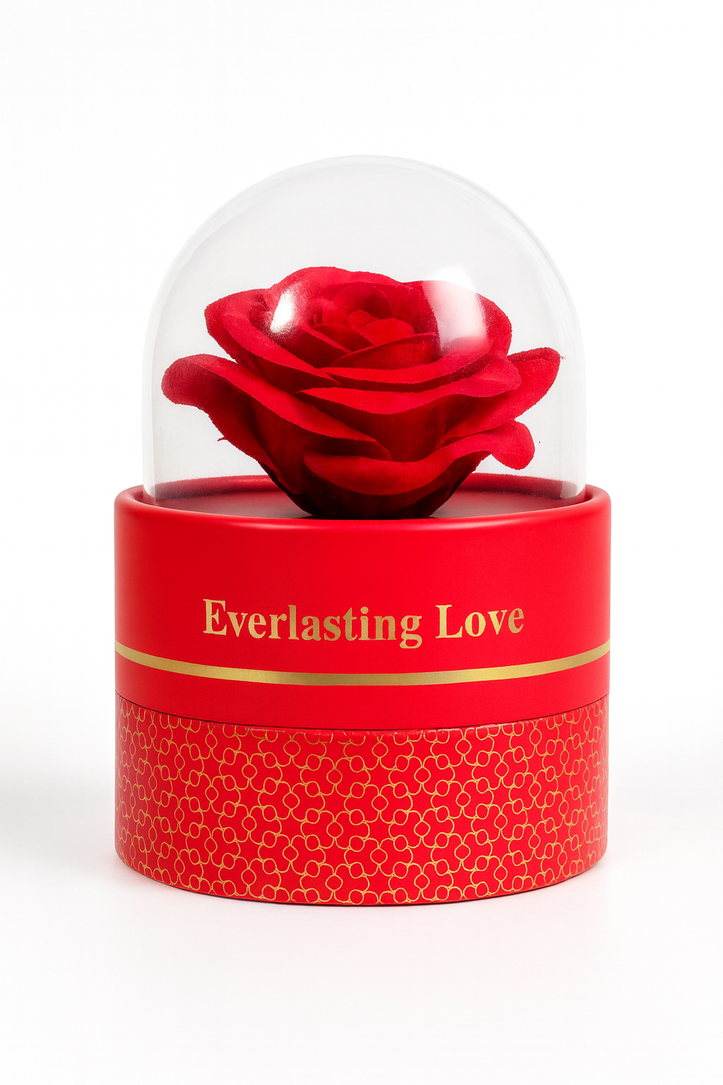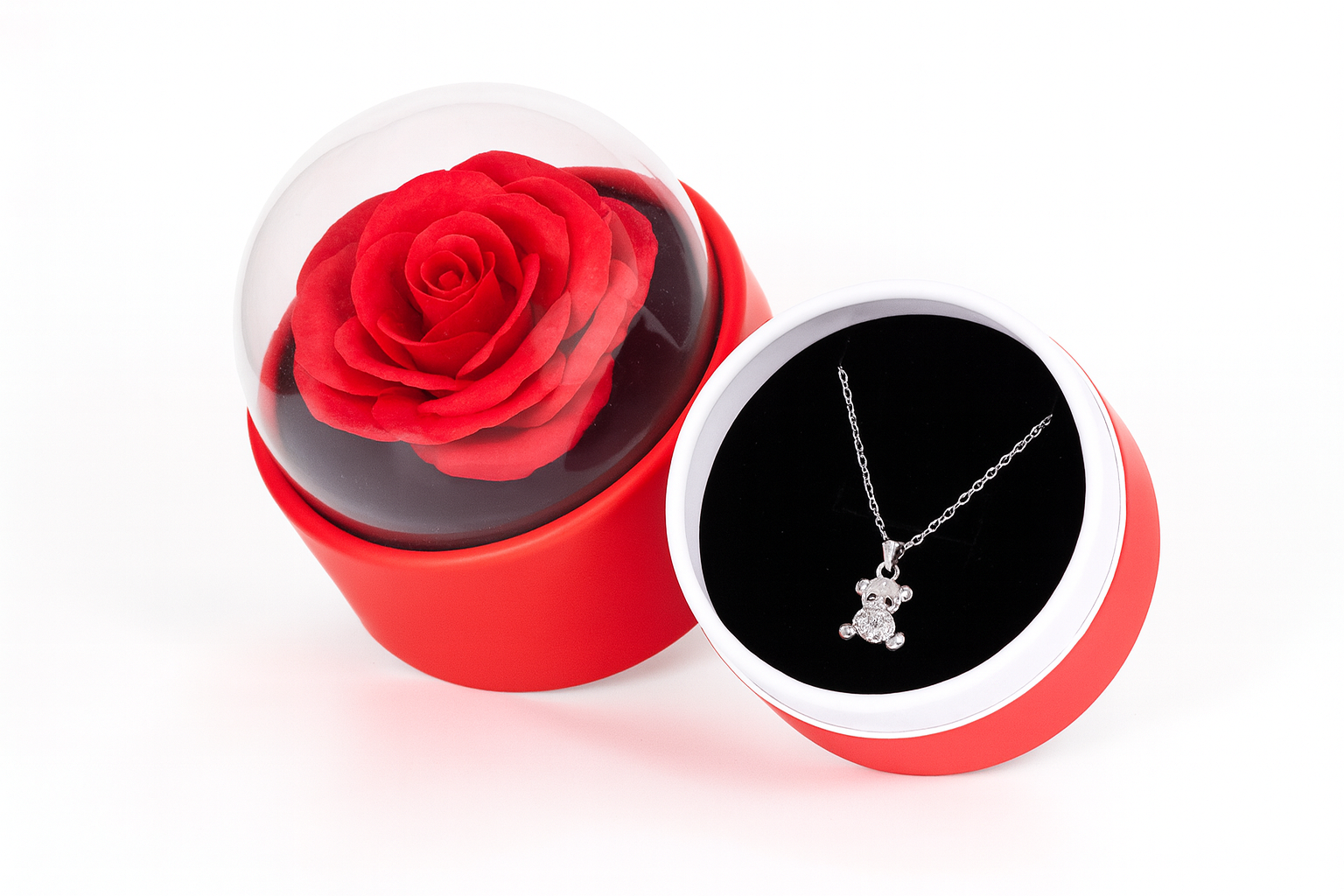 Un cadou care imbina eleganta, emotia si rafinamentul intr-o prezentare cu adevarat spectaculoasa. Cutia Best Wishes, in nuanta rosie intensa, ascunde sub cupola transparenta un trandafir din sapun, lucrat cu petale fine ce imita perfect o floare reala. Alaturi, intr-un compartiment dedicat, se afla un colier delicat, gandit sa straluceasca discret si sa aduca un plus de magie momentului oferirii.