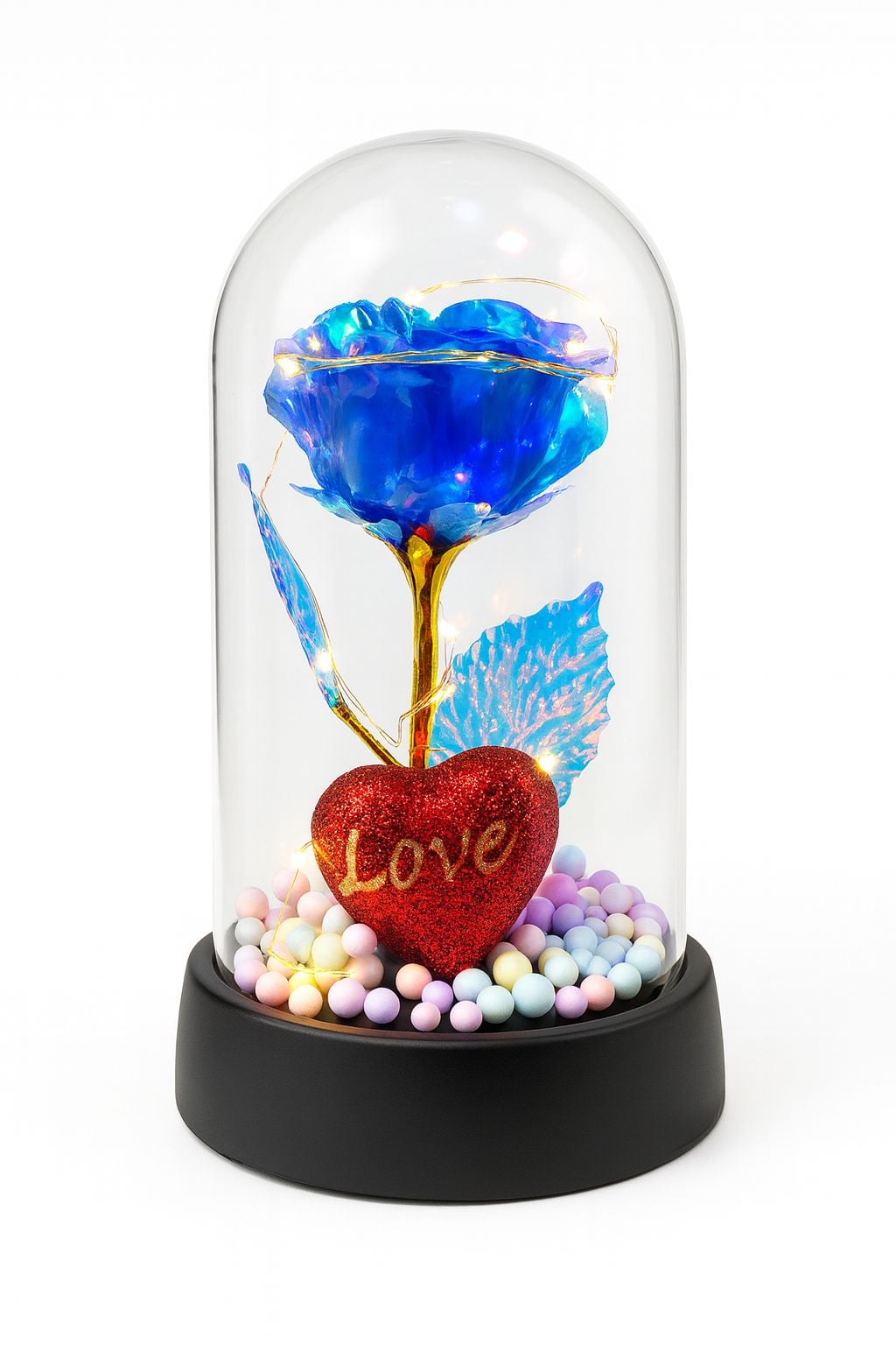 Design: Trandafir albastru in cupola de plastic, baza neagra, inima rosie "LOVE", lumini LED.