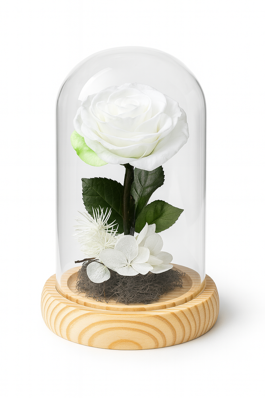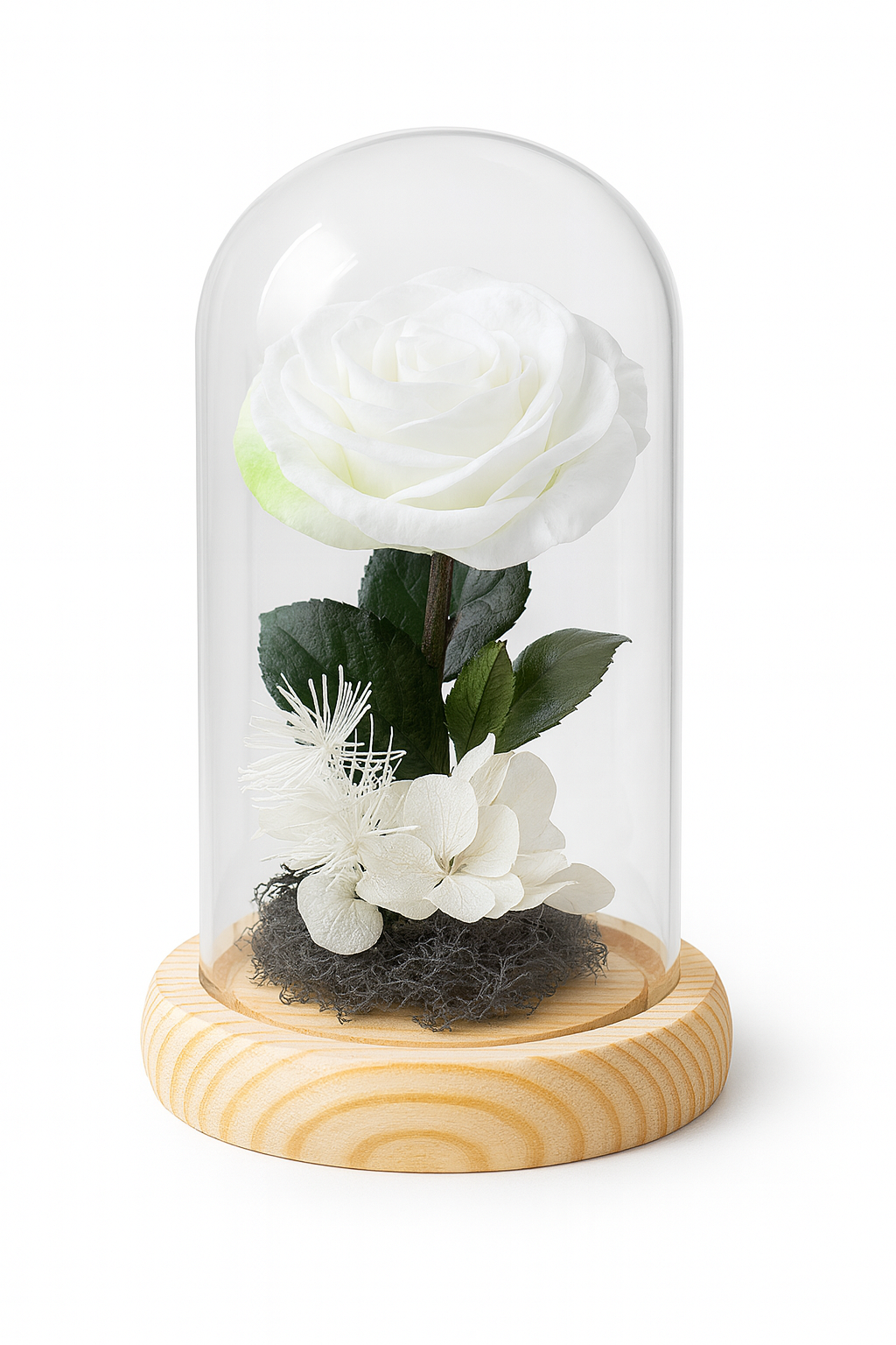 Transforma orice moment într-un cadou memorabil cu acest aranjament elegant în cupola de sticla, ce include un trandafir criogenat alb, atent conservat pentru a-si păstra frumusețea ani la rand. Baza din lemn adauga un aspect natural si rafinat, iar combinația dintre sticla clara si trandafirul alb creeaza un decor sofisticat, ideal pentru living, birou sau dormitor.
