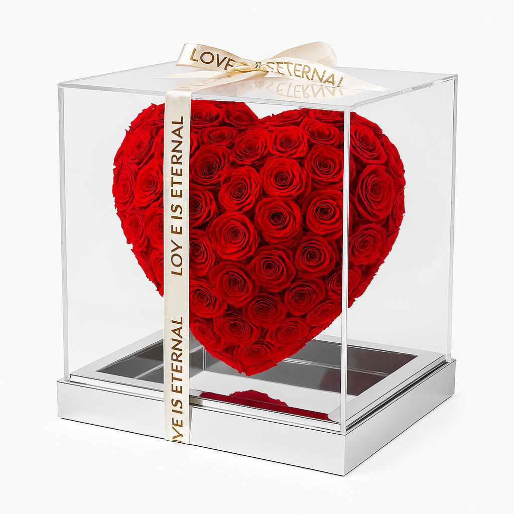 Cutia transparenta premium permite aprecierea aranjamentului din orice unghi, iar baza oglinda intensifica efectul vizual, reflectand forma inimii si adaugand o nota de lux suplimentara. Panglica eleganta “LOVE IS ETERNAL” completeaza perfect prezentarea, facand cadoul gata de oferit fara nicio pregatire suplimentara.