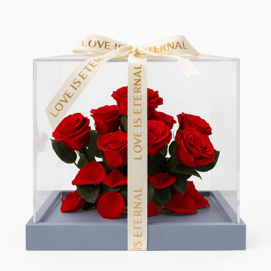 Ofera un cadou unic, elegant si plin de rafinament cu aceasta cutie premium ce contine 9 trandafiri criogenati rosii, expusi intr-o vitrina transparenta cu design modern si banda decorativa “LOVE IS ETERNAL”. Aranjamentul impresioneaza prin simplitatea sofisticata si prin impactul vizual intens, fiind alegerea perfecta pentru Valentines Day, 8 Martie, Martisor, aniversari, onomastici sau momentele in care vrei sa transmiti un mesaj puternic de iubire si apreciere.