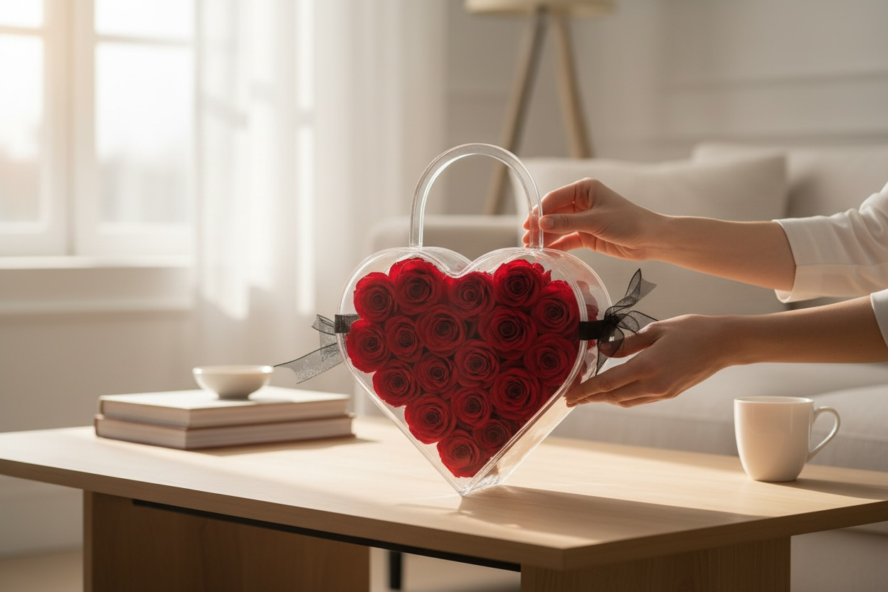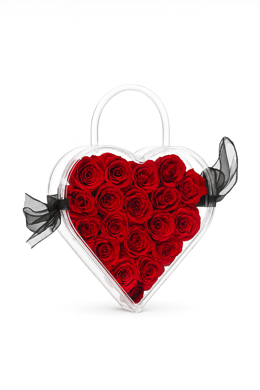 Ofera un cadou cu adevarat impresionant si sofisticat cu aceasta inima transparenta tip geanta, ce contine 19 trandafiri criogenati rosii, aranjati cu eleganta si atentie la detalii. Datorita designului sau modern, luxos si unic, acest aranjament devine alegerea perfecta pentru Valentines Day, Martisor, 8 Martie, aniversari, onomastici sau momentele in care vrei sa exprimi iubire si rafinament la cel mai inalt nivel.