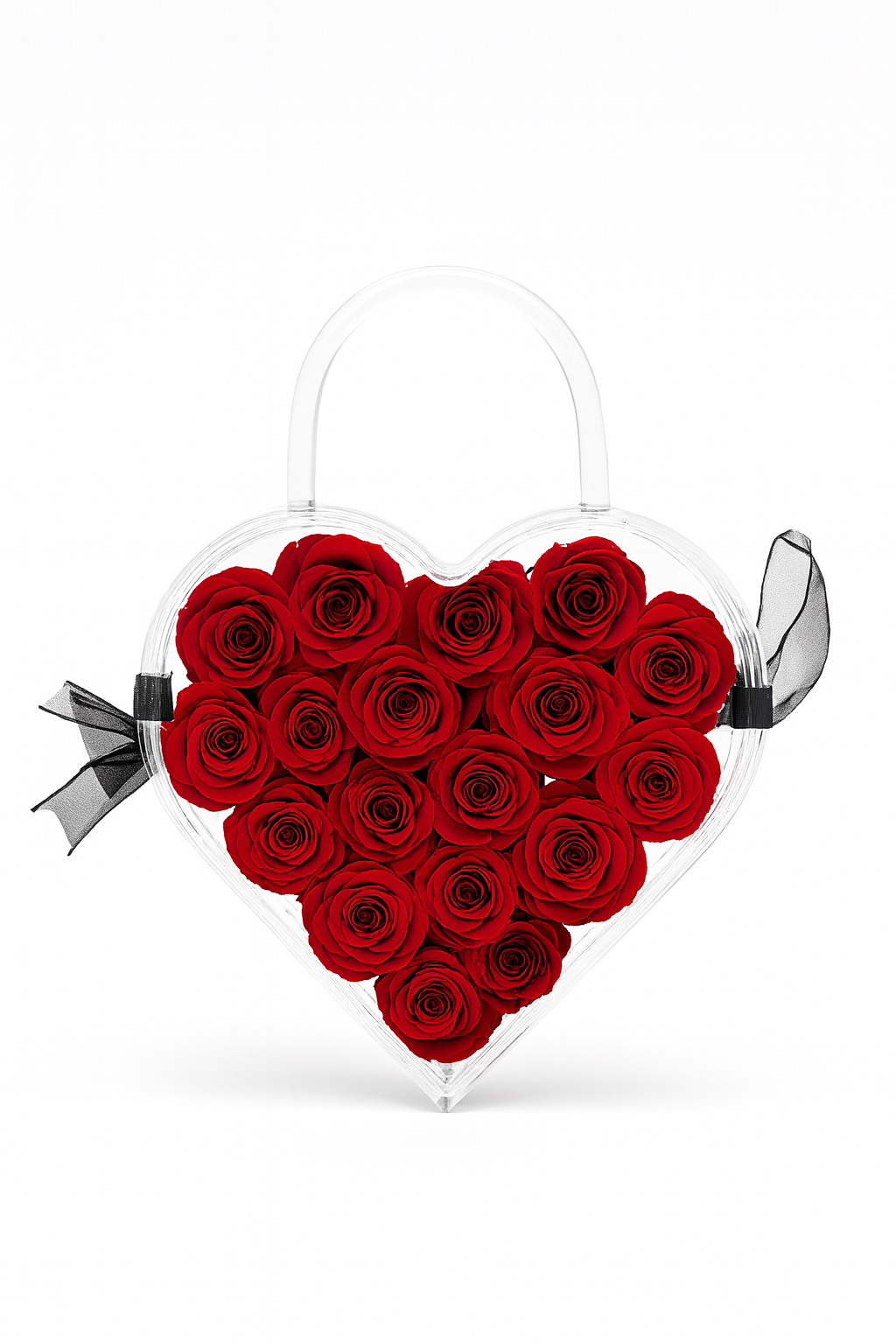 Inima transparenta pune in valoare fiecare floare, creand o compozitie vizuala moderna si premium. Designul este completat de doua panglici fine din tul negru, care adauga un plus de stil si eleganta.