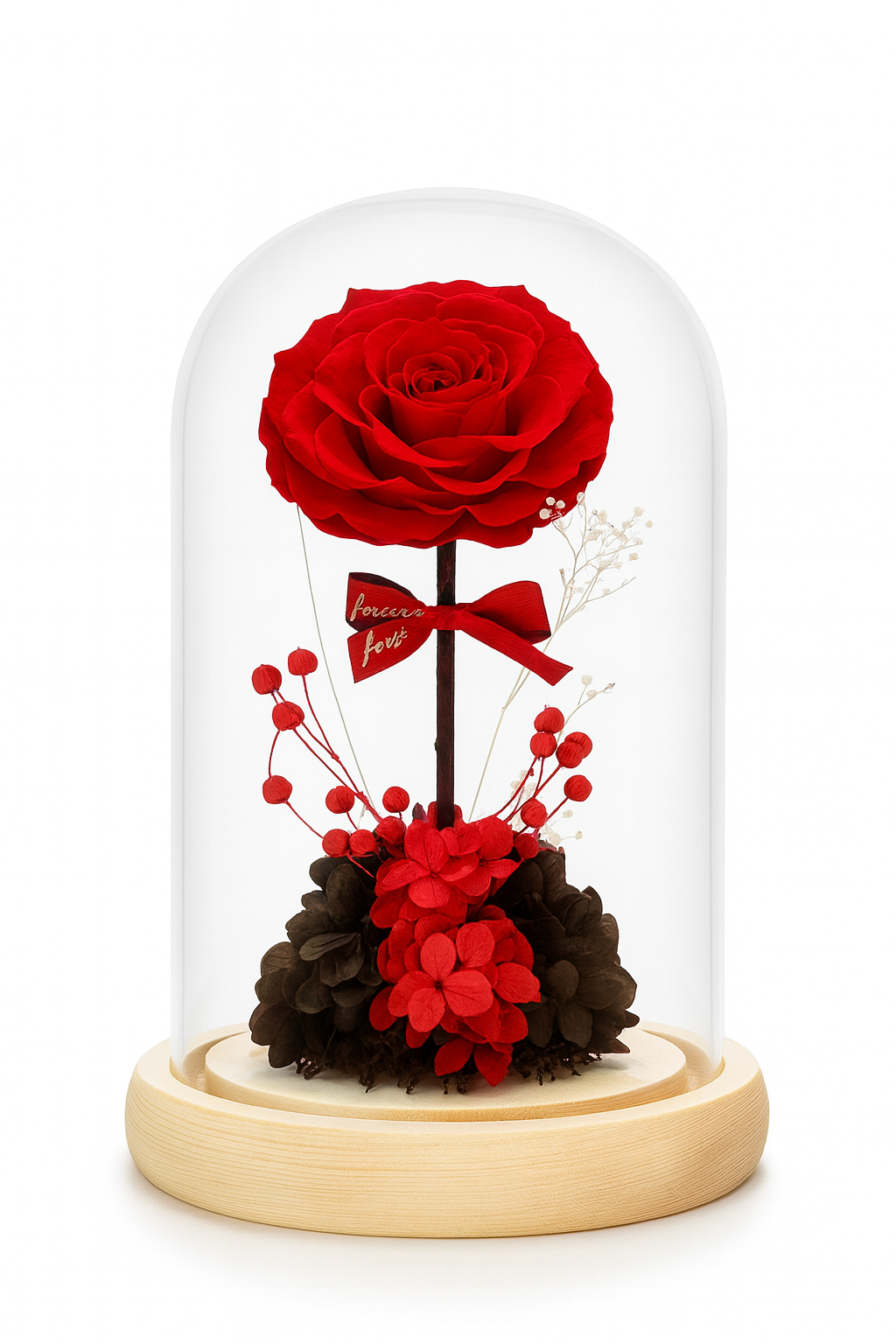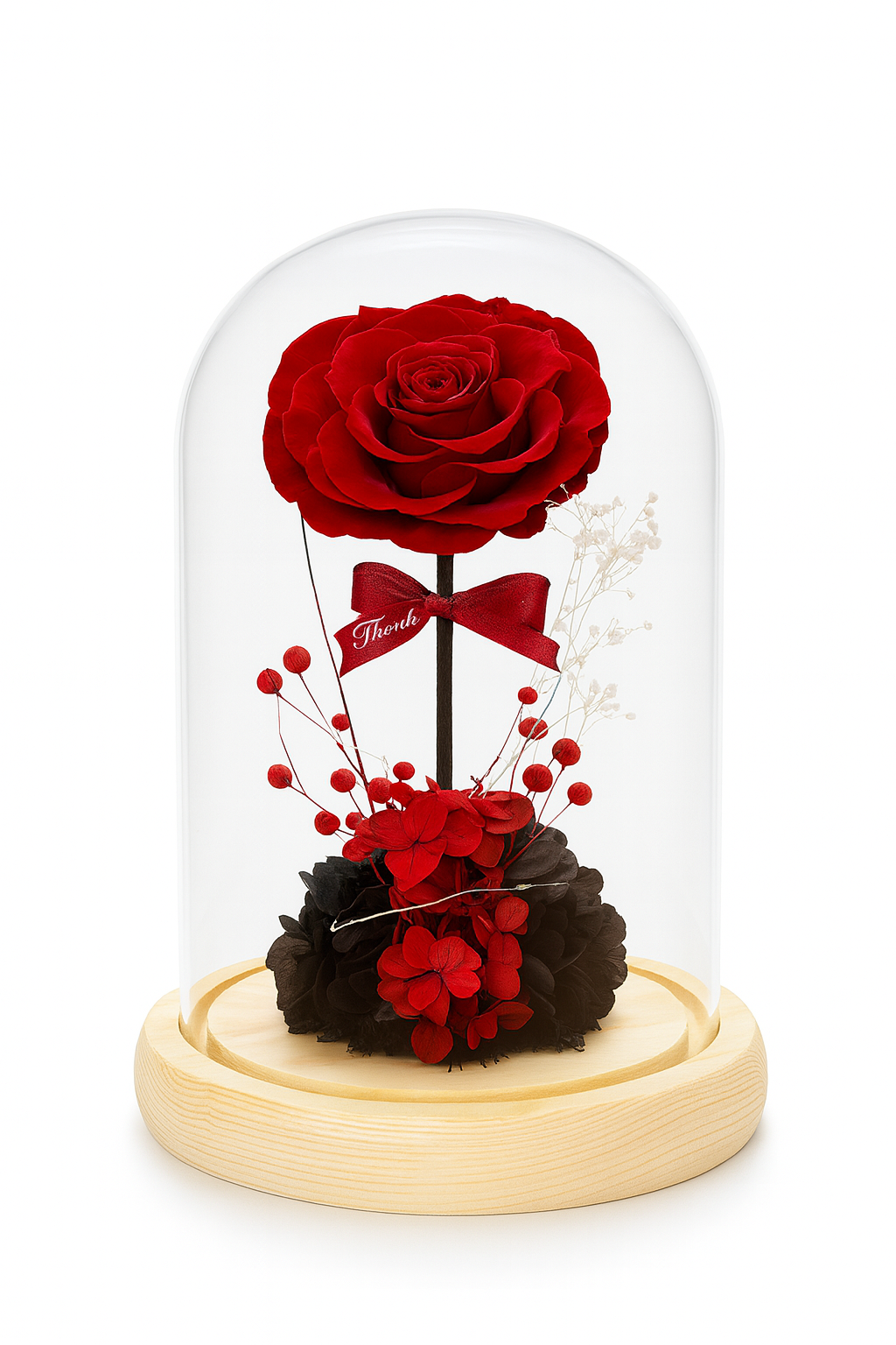 Decorul floral natural, realizat manual, completeaza perfect aranjamentul, iar cupola din sticla protejeaza trandafirul si ii amplifica stralucirea. Baza din lemn ofera stabilitate, iar LED-urile creeaza o atmosfera romantica, transformand produsul intr-o adevarata piesa de decor premium.