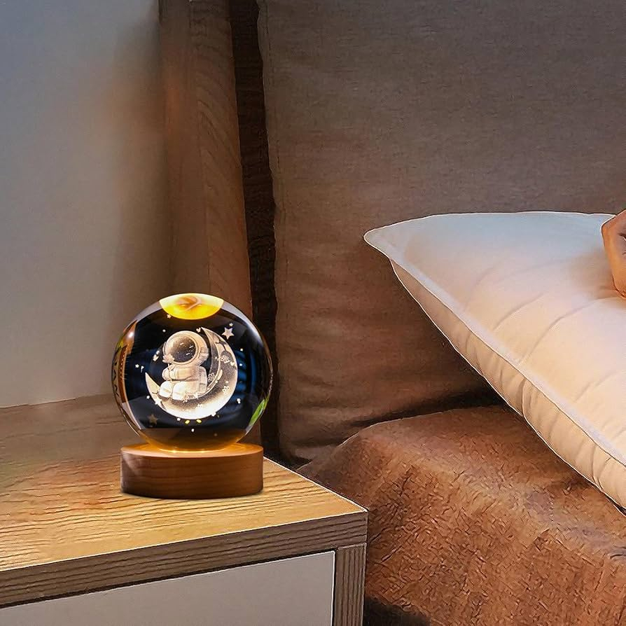 Lumina se reflecta prin cristalul optic transparent si subliniaza silueta astronautului, stelele si luna, oferind o atmosfera relaxanta, perfecta pentru dormitor, living, birou sau camera copiilor. Este ideal ca lampa de veghe, decor modern sau cadou tematic pentru iubitorii de astronomie, pentru pasionatii de spatiu sau pentru cei care apreciaza obiectele elegante si creative.