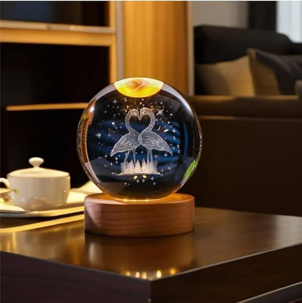 Globul este asezat pe o baza din lemn natural dotata cu iluminare LED calda, care patrunde in cristal si pune in valoare intregul model 3D. Efectul rezultat este spectaculos: o lumina blanda, ambientala, ideala pentru dormitor, living sau birou. Lumina calda contribuie la o atmosfera relaxanta si romantica, perfecta pentru seri linistite sau momente speciale in cuplu.