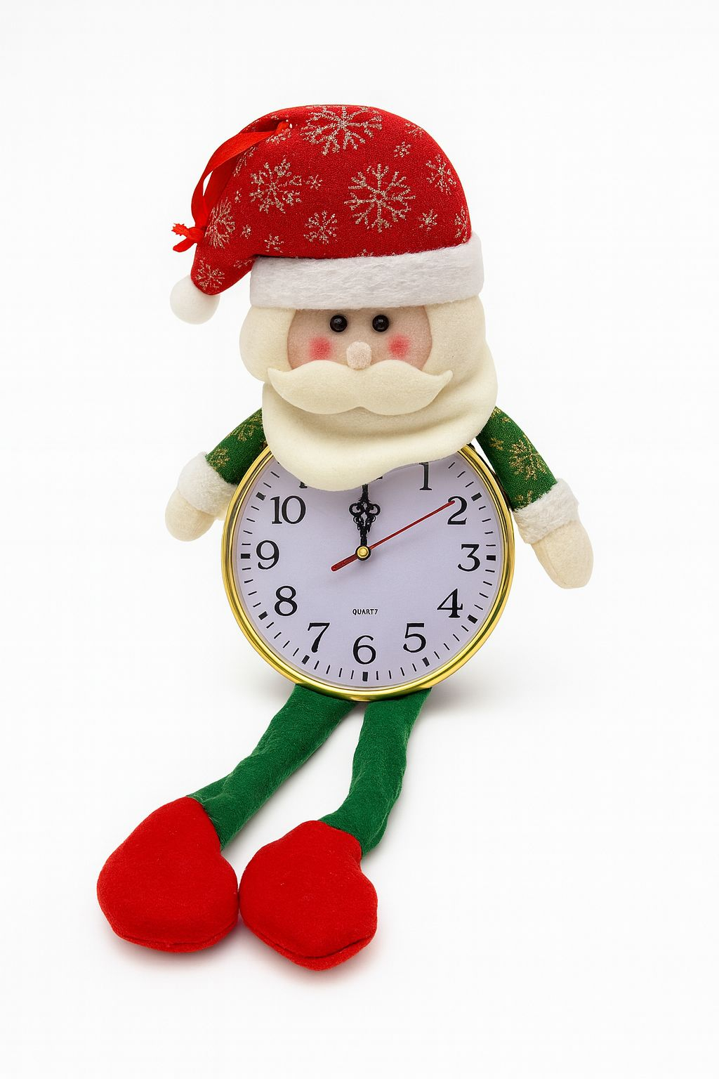 Ceas decorativ de Crăciun în forma unui Moș Crăciun vesel, ideal pentru a aduce un strop de magie în casă în perioada sărbătorilor. Cadranul rotund și clar asigură o vizibilitate excelentă, iar corpul moale din material textil oferă un aspect prietenos și festiv.