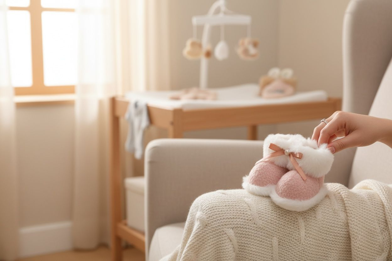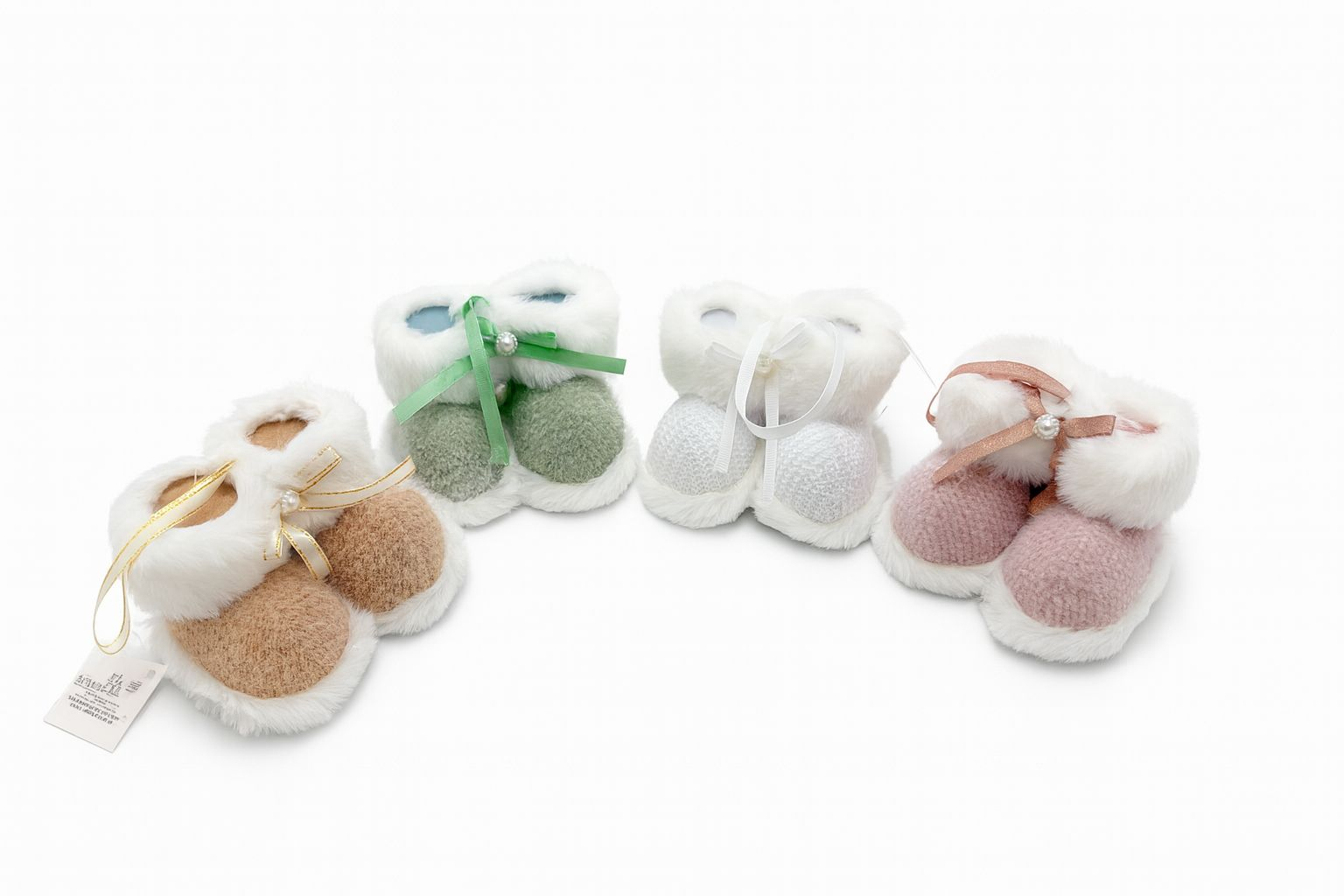 Decoratiune pentru brad in forma de pereche de botosei pentru bebelusi, realizata din plus moale si material textil pufos. Fiecare pereche este prevazuta cu panglica colorata si perluta decorativa, oferind un aspect delicat si elegant.
