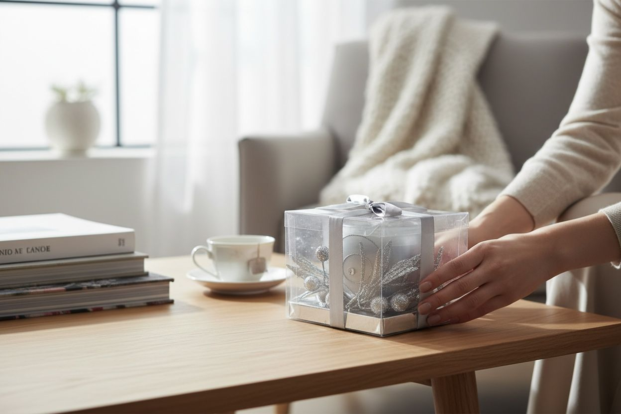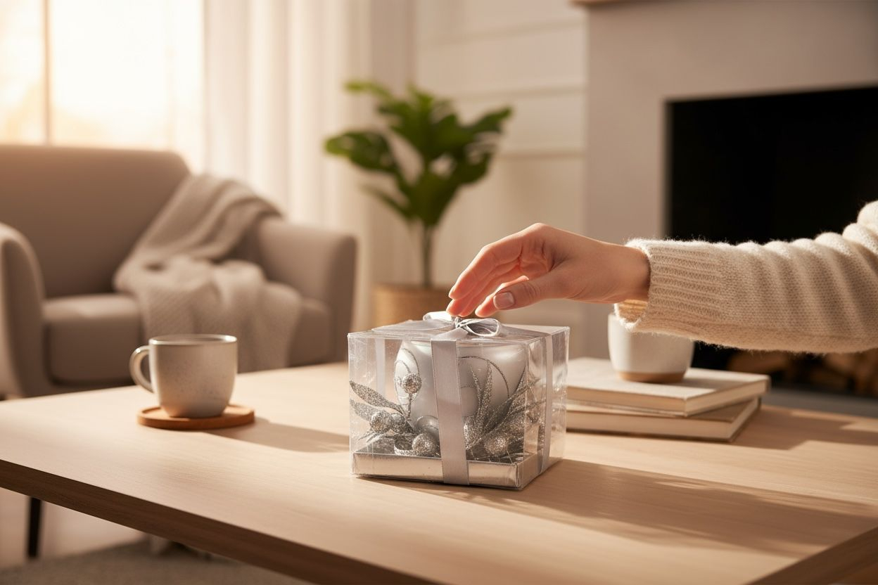 Adauga o nota eleganta sarbatorilor cu acest set decorativ de Craciun, ce include o lumare argintie fin decorata si asezata intr-o cutie transparenta, legata cu funda satinata. Designul modern, nuantele reci si accentele glitter ofera un aspect sofisticat, perfect pentru cadouri, decorul mesei sau pentru a completa atmosfera festiva din orice incapere.