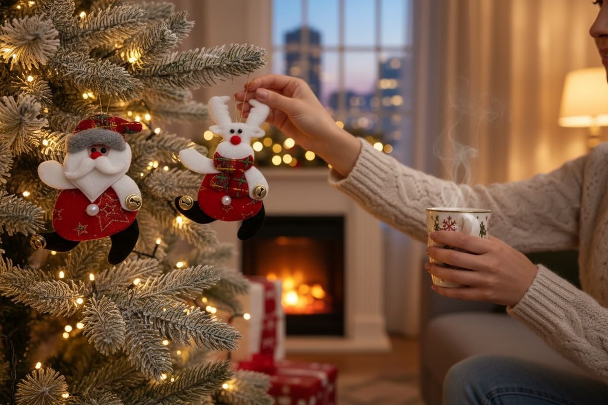 Set de 12 decoratiuni textile pentru Craciun, realizate in stil festiv, cu modele adorabile: ren, om de zapada si ursulet. Fiecare decoratiune este prevazuta cu agatatoare aurie si detalii brodate, fulare si caciuli din material textil, plus un clopotel metalic pentru un plus de farmec.