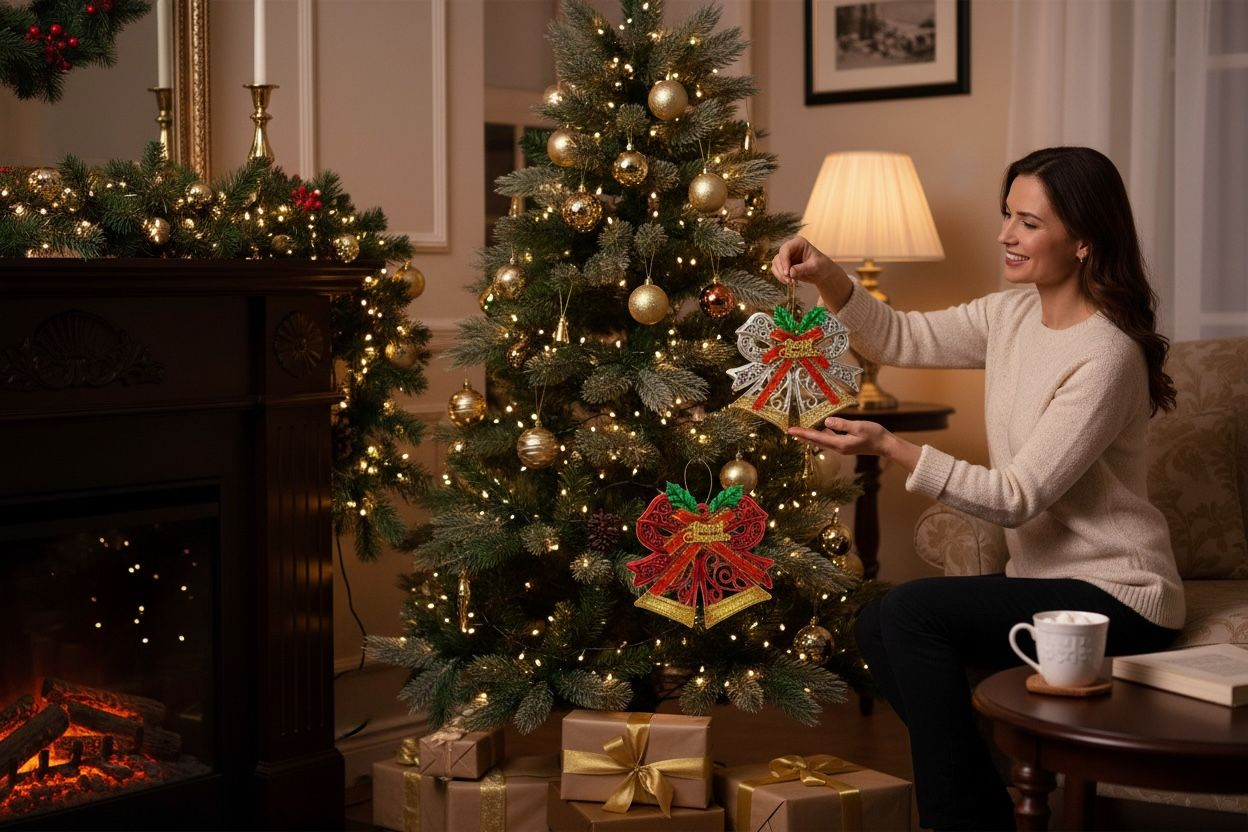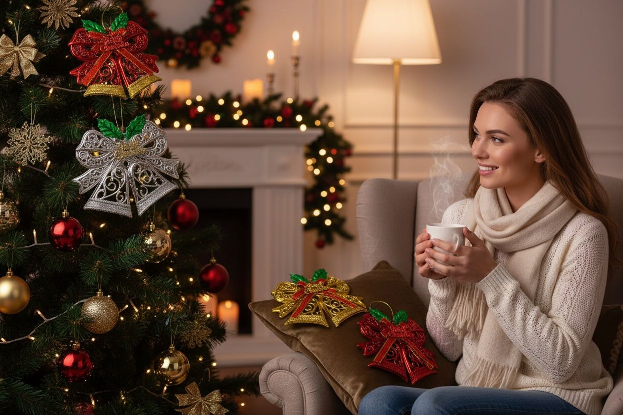 Impodobeste bradul si decorul casei cu acest set de 12 ornamente tip clopotei, realizate in culori festive si detalii stralucitoare. Fiecare decor prezinta o fundita eleganta, frunze de ilex si inscriptie aurie "Merry Christmas", oferind un aspect traditional si plin de farmec.