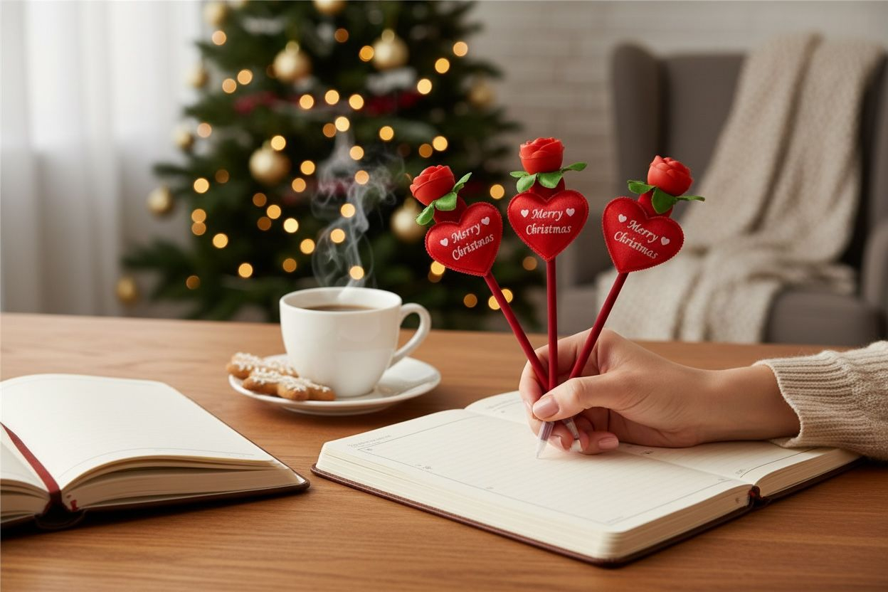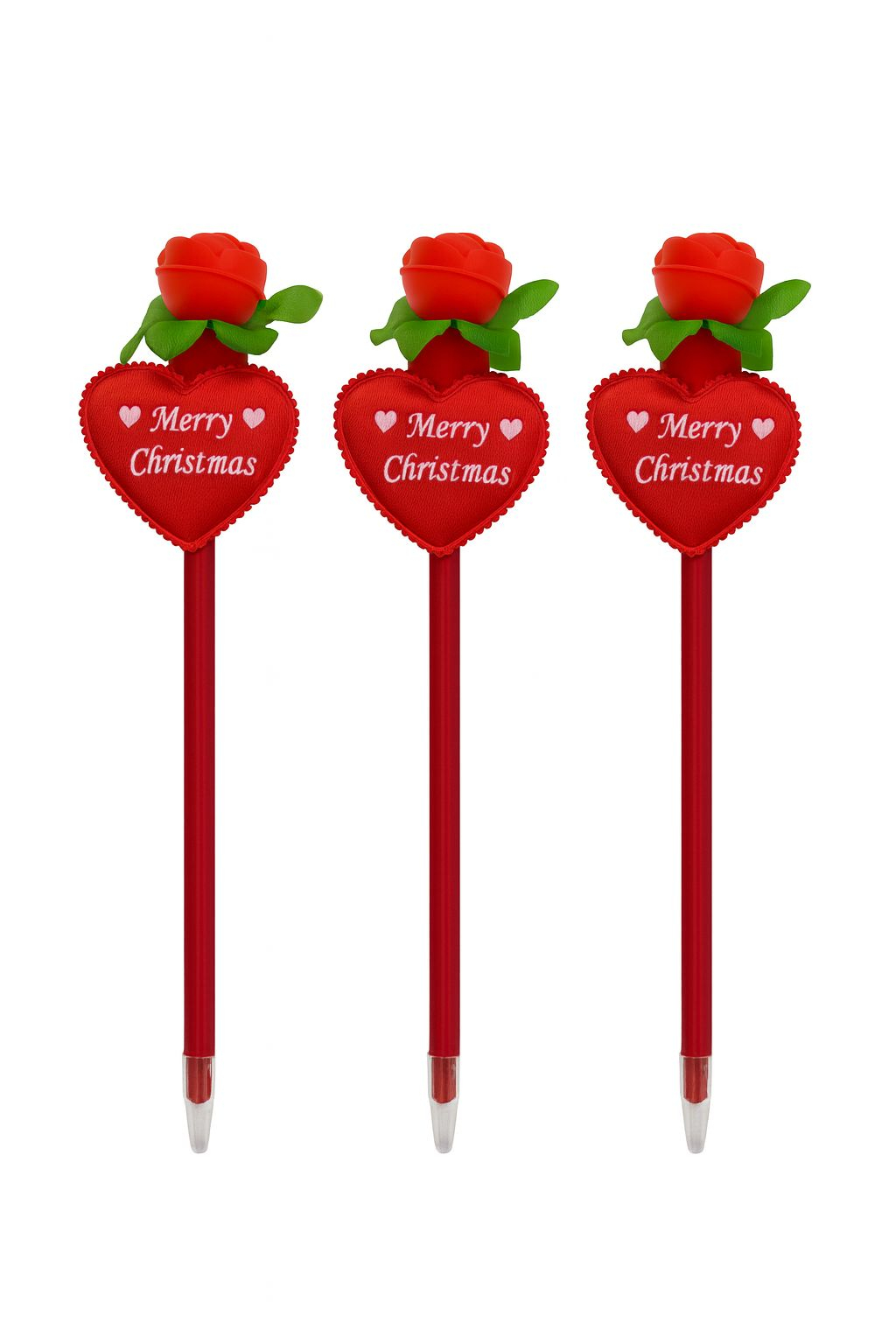Adu magia sarbatorilor la birou sau la scoala cu acest set de 12 pixuri de Craciun cu lumini LED. Fiecare pix este decorat cu inimioara inscriptionata "Merry Christmas" si trandafir vesel in partea superioara, transformand orice notita intr-un mic moment festiv.