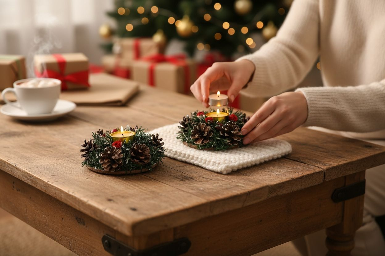 Set 2 suporturi lumanari Craciun cu conuri de brad si decoratiuni festive