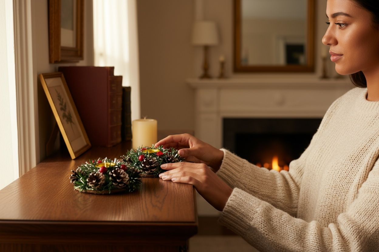 Adu farmecul sarbatorilor in casa ta cu acest set elegant de suporturi pentru lumanari, decorate manual cu conuri de brad naturale, accente rosii si elemente verzi de sezon.