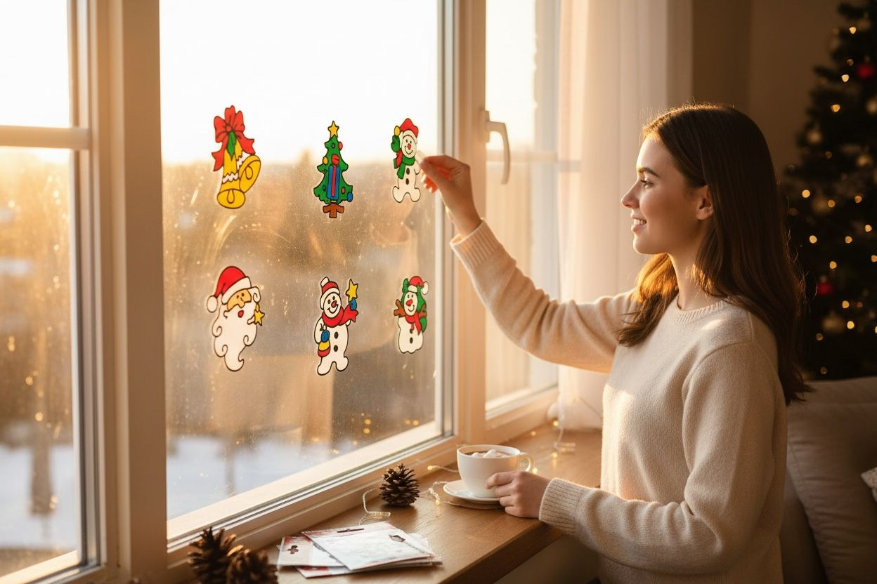 Avantajul major este ca sunt reutilizabile; le poti dezlipi fara a lasa urme de adeziv inestetice si le poti repozitiona ori de cate ori doresti. Setul include modele diverse si colorate, precum cel cu bradut si clopotei din imagine, perfecte pentru a aduce magia Craciunului in orice incapere.