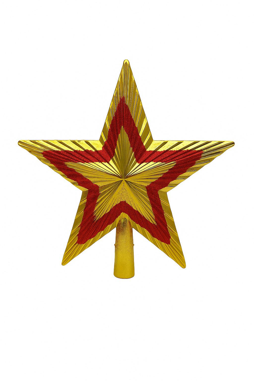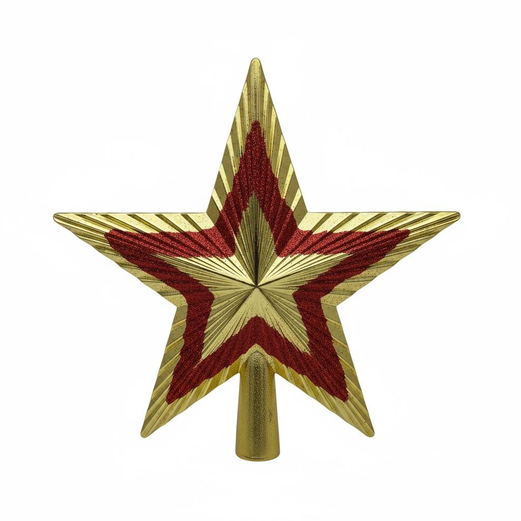 Varf decorativ pentru brad in forma de stea aurie, accentuata cu un model rosu central. Realizat din material plastic usor, cu suprafata texturata si reflexii metalice, varful adauga un efect elegant si luminos oricarui brad de Craciun.