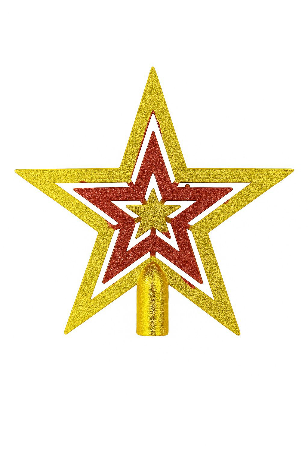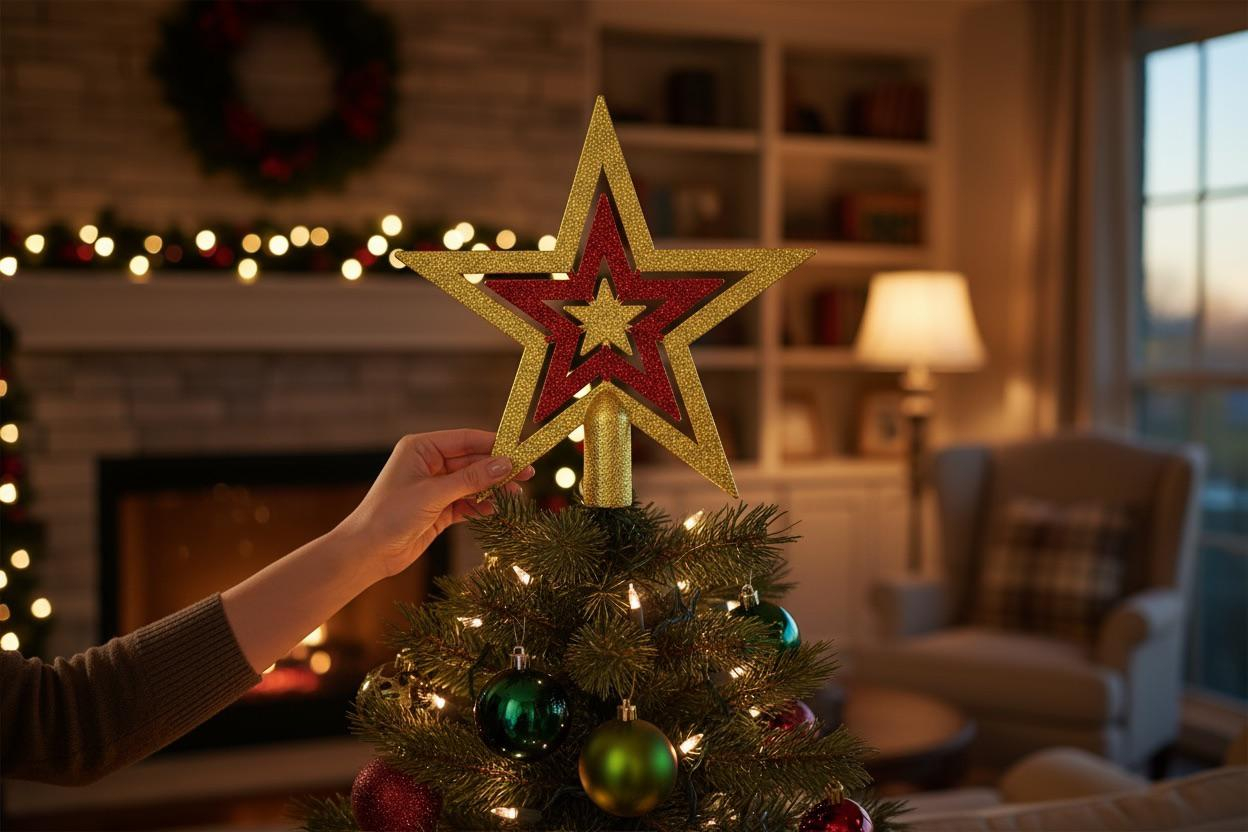Varf decorativ pentru brad in forma de stea aurie decupata, cu stea rosie glitter in interior si un element central aurit. Designul stratificat creeaza un efect vizual modern si stralucitor, perfect pentru completarea decorului de Craciun.